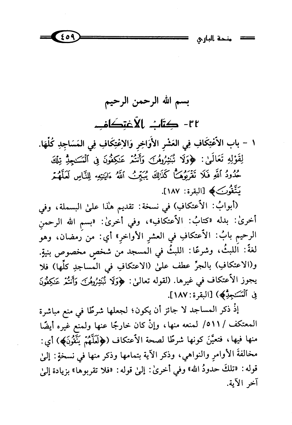 (أبوابُ: الاعتكافِ) في نسخة: تقديم هذا على البسملة، وفي أخرى: بدله "كتابُ: الاعتكافِ"، وفي أخرى: "بسمِ الله الرحمنِ الرحيمِ بابُ: الاعتكافِ في العشرِ الأواخرِ" أي: من رمضان، وهو لغةً: اللبثُ، وشرعًا: اللبثُ في المسجد من شخصٍ مخصوص بنيةٍ. و (الاعتكافِ) بالجرِّ عطف على (الاعتكافِ في المساجدِ كلِّها) فلا يجوز الاعتكاف في غيرها. (لقوله تعالى: {وَلَا تُبَاشِرُوهُنَّ وَأَنْتُمْ عَاكِفُونَ فِي الْمَسَاجِدِ} [البقرة: 187].
