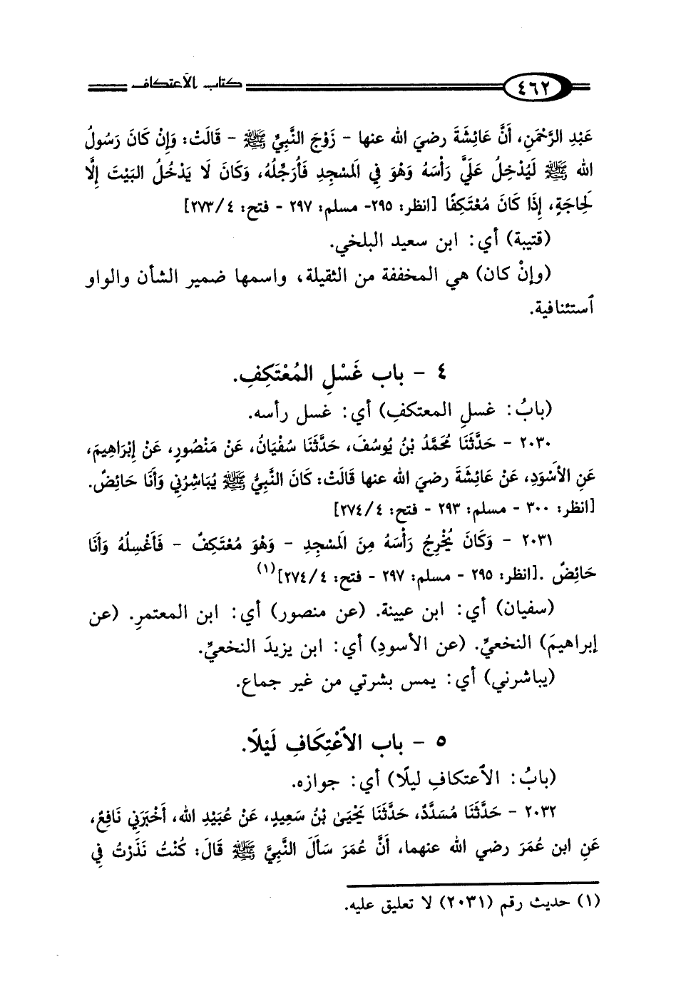 2031 - وَكَانَ يُخْرِجُ رَأْسَهُ مِنَ المَسْجِدِ وَهُوَ مُعْتَكِفٌ، فَأَغْسِلُهُ وَأَنَا حَائِضٌ".