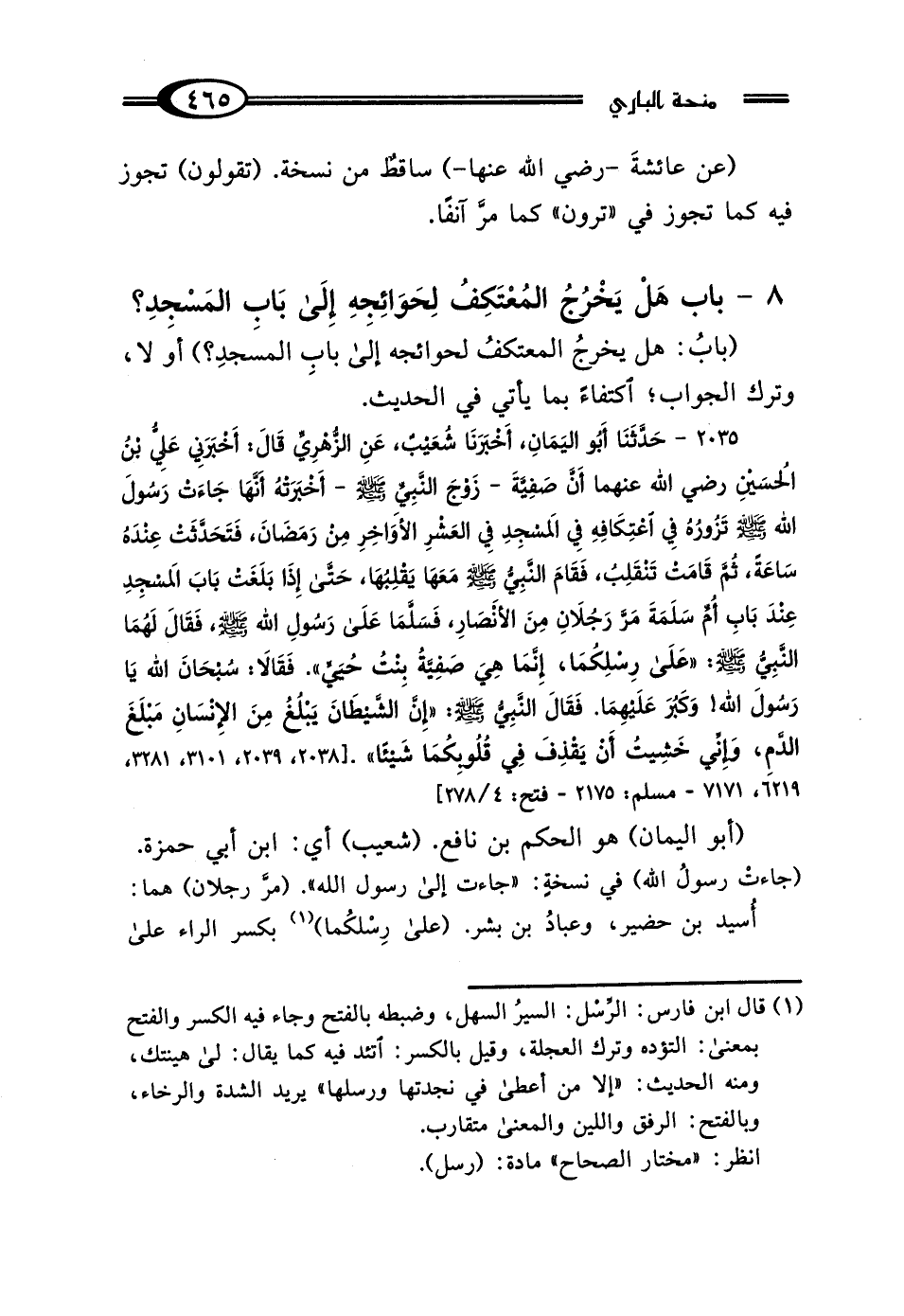 2035 - حَدَّثَنَا أَبُو اليَمَانِ، أَخْبَرَنَا شُعَيْبٌ، عَنِ الزُّهْرِيِّ، قَال: أَخْبَرَنِي عَلِيُّ بْنُ الحُسَيْنِ رَضِيَ اللَّهُ عَنْهُمَا: أَنَّ صَفِيَّةَ - زَوْجَ النَّبِيِّ صَلَّى اللهُ عَلَيْهِ وَسَلَّمَ - أَخْبَرَتْهُ أَنَّهَا جَاءَتْ إِلَى رَسُولِ اللَّهِ صَلَّى اللهُ عَلَيْهِ وَسَلَّمَ تَزُورُهُ فِي اعْتِكَافِهِ فِي المَسْجِدِ فِي العَشْرِ الأَوَاخِرِ مِنْ رَمَضَانَ، فَتَحَدَّثَتْ عِنْدَهُ سَاعَةً، ثُمَّ قَامَتْ تَنْقَلِبُ، فَقَامَ النَّبِيُّ صَلَّى اللهُ عَلَيْهِ وَسَلَّمَ مَعَهَا يَقْلِبُهَا، حَتَّى إِذَا بَلَغَتْ بَابَ المَسْجِدِ عِنْدَ بَابِ أُمِّ سَلَمَةَ، مَرَّ رَجُلانِ مِنَ الأَنْصَارِ، فَسَلَّمَا عَلَى رَسُولِ اللَّهِ صَلَّى اللهُ عَلَيْهِ وَسَلَّمَ، فَقَال لَهُمَا النَّبِيُّ صَلَّى اللهُ عَلَيْهِ وَسَلَّمَ: "عَلَى رِسْلِكُمَا، إِنَّمَا هِيَ صَفِيَّةُ بِنْتُ حُيَيٍّ"، فَقَالا: سُبْحَانَ اللَّهِ يَا رَسُولَ اللَّهِ، وَكَبُرَ عَلَيْهِمَا، فَقَال النَّبِيُّ صَلَّى اللهُ عَلَيْهِ وَسَلَّمَ: "إِنَّ الشَّيْطَانَ يَبْلُغُ مِنَ الإِنْسَانِ مَبْلَغَ الدَّمِ، وَإِنِّي خَشِيتُ أَنْ يَقْذِفَ فِي قُلُوبِكُمَا شَيْئًا" [2038، 2039، 3101، 3281، 6219، 7171 - مسلم: 2175 - فتح: 4/ 278]