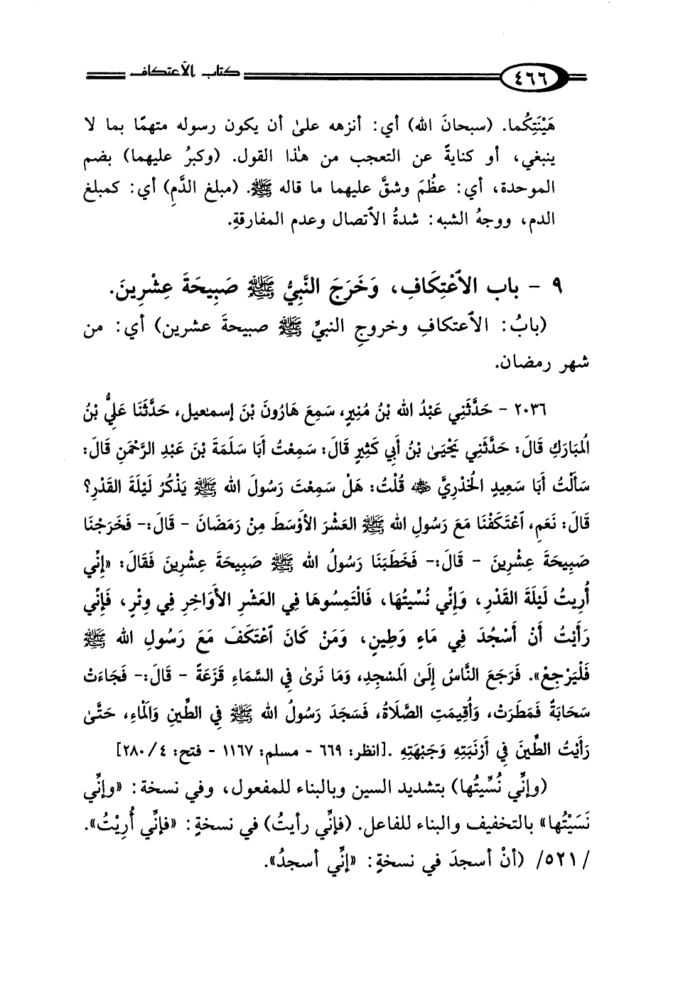 9 - بَابُ الاعْتِكَافِ وَخَرَجَ النَّبِيُّ صَلَّى اللهُ عَلَيْهِ وَسَلَّمَ صَبِيحَةَ عِشْرِينَ