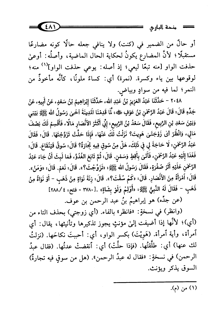 2048 - حَدَّثَنَا عَبْدُ العَزِيزِ بْنُ عَبْدِ اللَّهِ، حَدَّثَنَا إِبْرَاهِيمُ بْنُ سَعْدٍ، عَنْ أَبِيهِ، عَنْ جَدِّهِ، قَال: قَال عَبْدُ الرَّحْمَنِ بْنُ عَوْفٍ رَضِيَ اللَّهُ عَنْهُ: لَمَّا قَدِمْنَا المَدِينَةَ آخَى رَسُولُ اللَّهِ صَلَّى اللهُ عَلَيْهِ وَسَلَّمَ بَيْنِي وَبَيْنَ سَعْدِ بْنِ الرَّبِيعِ، فَقَال سَعْدُ بْنُ الرَّبِيعِ: إِنِّي أَكْثَرُ الأَنْصَارِ مَالًا، فَأَقْسِمُ لَكَ نِصْفَ مَالِي، وَانْظُرْ أَيَّ زَوْجَتَيَّ هَويتَ نَزَلْتُ لَكَ عَنْهَا، فَإِذَا حَلَّتْ، تَزَوَّجْتَهَا، قَال: فَقَال لَهُ عَبْدُ الرَّحْمَنِ: لَا حَاجَةَ لِي فِي ذَلِكَ هَلْ مِنْ سُوقٍ فِيهِ تِجَارَةٌ؟ قَال: سُوقُ قَيْنُقَاعٍ، قَال: فَغَدَا إِلَيْهِ عَبْدُ الرَّحْمَنِ، فَأَتَى بِأَقِطٍ وَسَمْنٍ، قَال: ثُمَّ تَابَعَ الغُدُوَّ، فَمَا لَبِثَ أَنْ جَاءَ عَبْدُ الرَّحْمَنِ عَلَيْهِ أَثَرُ صُفْرَةٍ، فَقَال رَسُولُ اللَّهِ صَلَّى اللهُ عَلَيْهِ وَسَلَّمَ: "تَزَوَّجْتَ؟ "، قَال: نَعَمْ، قَال: "وَمَنْ؟ "، قَال: امْرَأَةً مِنَ الأَنْصَارِ، قَال: "كَمْ سُقْتَ؟ "، قَال: زِنَةَ نَوَاةٍ مِنْ ذَهَبٍ - أَوْ نَوَاةً مِنْ ذَهَبٍ -، فَقَال لَهُ النَّبِيُّ صَلَّى اللهُ عَلَيْهِ وَسَلَّمَ: "أَوْلِمْ وَلَوْ بِشَاةٍ".