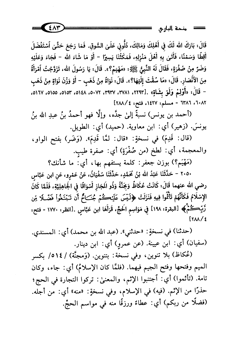 2050 - حَدَّثَنَا عَبْدُ اللَّهِ بْنُ مُحَمَّدٍ، حَدَّثَنَا سُفْيَانُ، عَنْ عَمْرٍو، عَنِ ابْنِ عَبَّاسٍ رَضِيَ اللَّهُ عَنْهُمَا، قَال: "كَانَتْ عُكَاظٌ، وَمَجَنَّةُ، وَذُو المَجَازِ، أَسْوَاقًا فِي الجَاهِلِيَّةِ، فَلَمَّا كَانَ الإِسْلامُ، فَكَأَنَّهُمْ تَأَثَّمُوا فِيهِ، فَنَزَلَتْ: {لَيْسَ عَلَيْكُمْ جُنَاحٌ أَنْ تَبْتَغُوا فَضْلًا مِنْ رَبِّكُمْ} [البقرة: 198] فِي مَوَاسِمِ الحَجِّ " قَرَأَهَا ابْنُ عَبَّاسٍ.