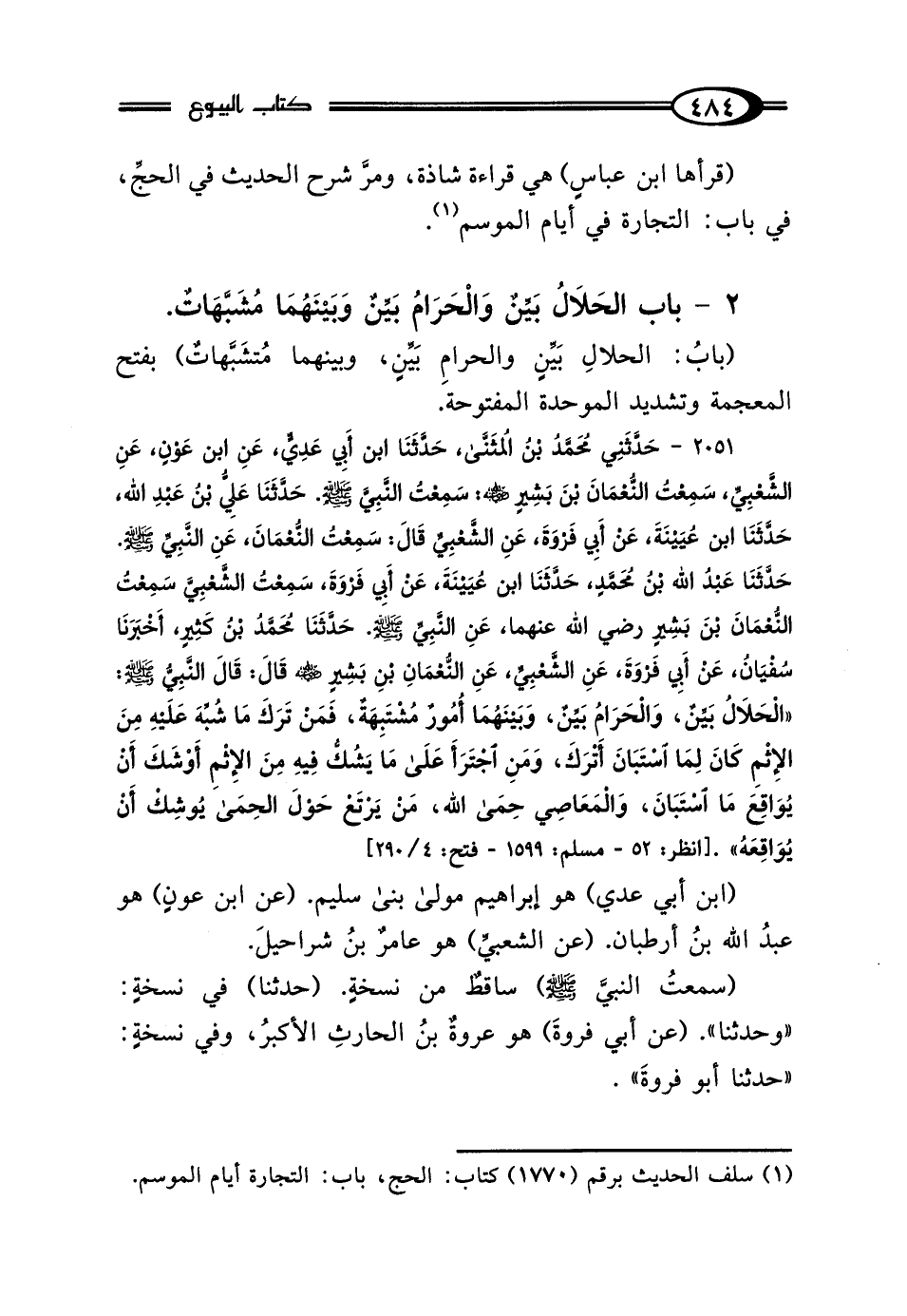 2051 - حَدَّثَنِي مُحَمَّدُ بْنُ المُثَنَّى، حَدَّثَنَا ابْنُ أَبِي عَدِيٍّ، عَنِ ابْنِ عَوْنٍ، عَنِ الشَّعْبِيِّ، سَمِعْتُ النُّعْمَانَ بْنَ بَشِيرٍ رَضِيَ اللَّهُ عَنْهُ، سَمِعْتُ النَّبِيَّ صَلَّى اللهُ عَلَيْهِ وَسَلَّمَ، وحَدَّثَنَا عَلِيُّ بْنُ عَبْدِ اللَّهِ، حَدَّثَنَا ابْنُ عُيَيْنَةَ، حَدَّثَنَا أَبُو فَرْوَةَ، عَنِ الشَّعْبِيِّ، قَال: سَمِعْتُ النُّعْمَانَ بْنَ بَشِيرٍ، قَال: سَمِعْتُ النَّبِيَّ صَلَّى اللهُ عَلَيْهِ وَسَلَّمَ، وحَدَّثَنَا عَبْدُ اللَّهِ بْنُ مُحَمَّدٍ، حَدَّثَنَا ابْنُ عُيَيْنَةَ، عَنْ أَبِي فَرْوَةَ، سَمِعْتُ الشَّعْبِيَّ، سَمِعْتُ النُّعْمَانَ بْنَ بَشِيرٍ رَضِيَ اللَّهُ عَنْهُمَا، عَنِ النَّبِيِّ صَلَّى اللهُ عَلَيْهِ وَسَلَّمَ، حَدَّثَنَا مُحَمَّدُ بْنُ كَثِيرٍ، أَخْبَرَنَا سُفْيَانُ، عَنْ أَبِي فَرْوَةَ، عَنِ الشَّعْبِيِّ، عَنِ النُّعْمَانِ بْنِ بَشِيرٍ رَضِيَ اللَّهُ عَنْهُ، قَال: قَال النَّبِيُّ صَلَّى اللهُ عَلَيْهِ وَسَلَّمَ: "الحَلالُ بَيِّنٌ، وَالحَرَامُ بَيِّنٌ، وَبَيْنَهُمَا أُمُورٌ مُشْتَبِهَةٌ، فَمَنْ تَرَكَ مَا شُبِّهَ عَلَيْهِ مِنَ الإِثْمِ، كَانَ لِمَا اسْتَبَانَ أَتْرَكَ، وَمَنِ اجْتَرَأَ عَلَى مَا يَشُكُّ فِيهِ مِنَ الإِثْمِ، أَوْشَكَ أَنْ يُوَاقِعَ مَا اسْتَبَانَ، وَالمَعَاصِي حِمَى اللَّهِ مَنْ يَرْتَعْ حَوْلَ الحِمَى يُوشِكُ أَنْ يُوَاقِعَهُ".