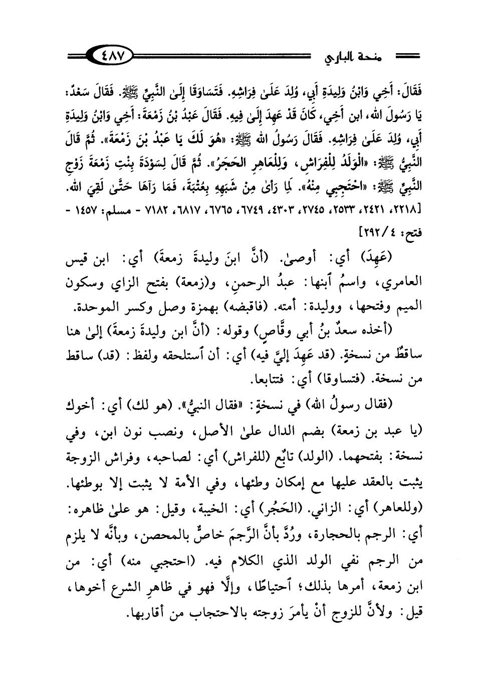 (فقال رسولُ الله) في نسخةٍ: "فقال النبيُّ". (هو لك) أي: أخوك (يا عبد بن زمعة) بضم الدال على الأصل، ونصب نون ابن، وفي نسخة: بفتحهما. (الولد) تابعٌ (للفراش) أي: لصاحبه، وفراش الزوجة يثبت بالعقد عليها مع إمكان وطئها، وفي الأمة لا يثبت إلا بوطئها. (وللعاهر) أي: الزاني. (الحَجُر) أي: الخيبة، وقيل: هو على ظاهره: أي: الرَّجْم بالحجارة، ورُدَّ بأنَّ الرَّجمَ خاصٌّ بالمحصن، وبأنَّه لا يلزم من الرَّجْم نفي الولد الّذي الكلام فيه. (احتجبي منه) أي: من ابن زمعة، أمرها بذلك؛ احتياطًا، وإلَّا فهو في ظاهرِ الشّرع أخوها، قيل: ولأنَّ للزوج أنّ يأمرَ زوجته بالاحتجاب من أقاربها.