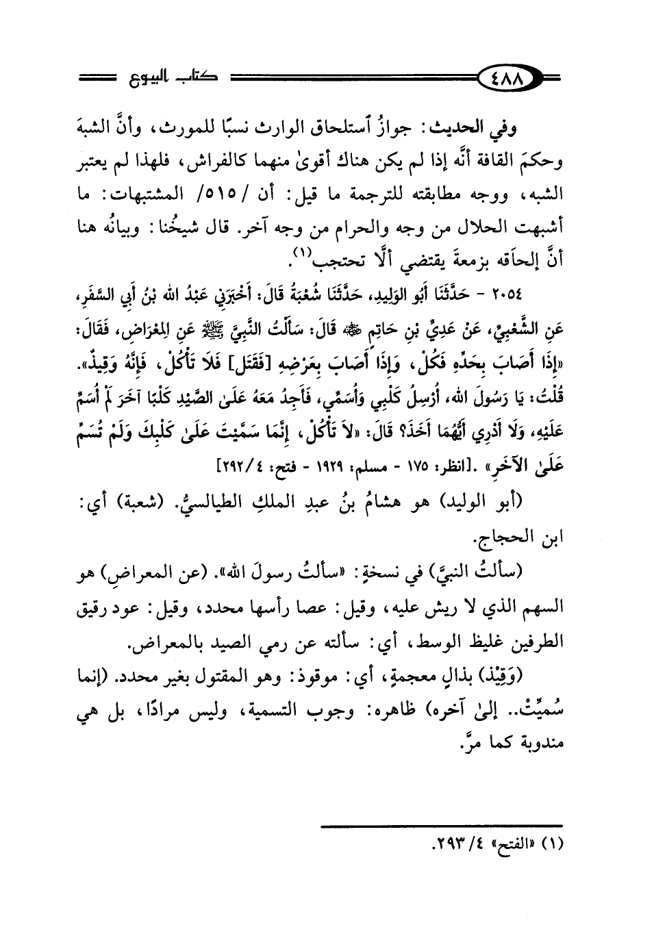 2054 - حَدَّثَنَا أَبُو الوَلِيدِ، حَدَّثَنَا شُعْبَةُ، قَال: أَخْبَرَنِي عَبْدُ اللَّهِ بْنُ أَبِي السَّفَرِ، عَنِ الشَّعْبِيِّ، عَنْ عَدِيِّ بْنِ حَاتِمٍ رَضِيَ اللَّهُ عَنْهُ، قَال: سَأَلْتُ النَّبِيَّ صَلَّى اللهُ عَلَيْهِ وَسَلَّمَ عَنِ المِعْرَاضِ، فَقَال: "إِذَا أَصَابَ بِحَدِّهِ فَكُلْ، وَإِذَا أَصَابَ بِعَرْضِهِ [فَقَتَلَ] فَلَا تَأْكُلْ فَإِنَّهُ وَقِيذٌ"، قُلْتُ: يَا رَسُولَ اللَّهِ أُرْسِلُ كَلْبِي وَأُسَمِّي، فَأَجِدُ مَعَهُ عَلَى الصَّيْدِ كَلْبًا آخَرَ لَمْ أُسَمِّ عَلَيْهِ، وَلَا أَدْرِي أَيُّهُمَا أَخَذَ؟ قَال: "لَا تَأْكُلْ، إِنَّمَا سَمَّيْتَ عَلَى كَلْبِكَ وَلَمْ تُسَمِّ عَلَى الآخَرِ".
