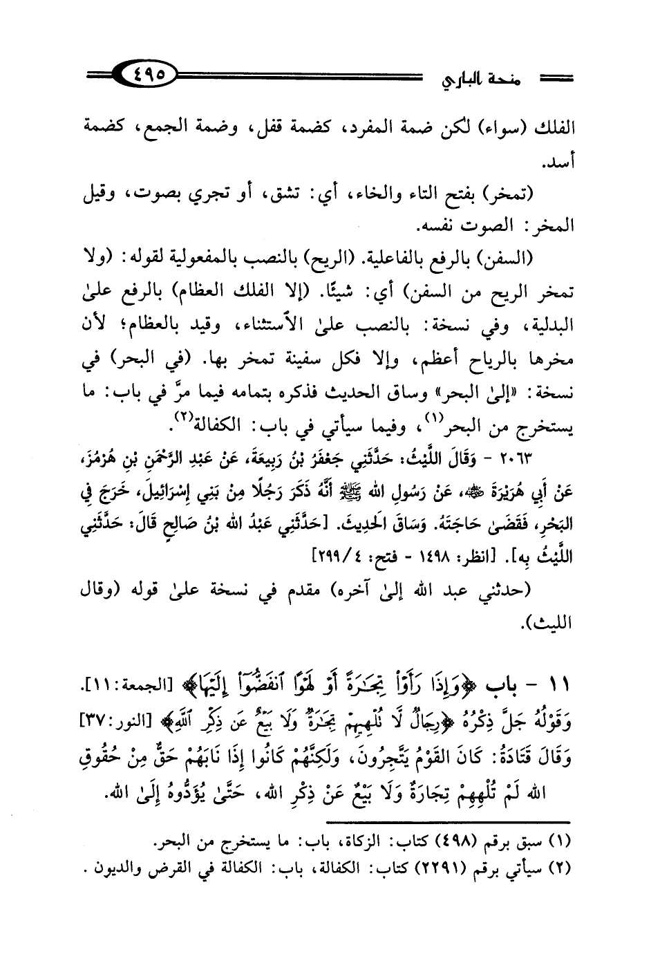 2063 - وَقَال اللَّيْثُ، حَدَّثَنِي جَعْفَرُ بْنُ رَبِيعَةَ، عَنْ عَبْدِ الرَّحْمَنِ بْنِ هُرْمُزَ، عَنْ أَبِي هُرَيْرَةَ رَضِيَ اللَّهُ عَنْهُ، عَنْ رَسُولِ اللَّهِ صَلَّى اللهُ عَلَيْهِ وَسَلَّمَ، أَنَّهُ: "ذَكَرَ رَجُلًا مِنْ بَنِي إِسْرَائِيلَ، خَرَجَ إِلَى البَحْرِ، فَقَضَى حَاجَتَهُ" وَسَاقَ الحَدِيثَ.