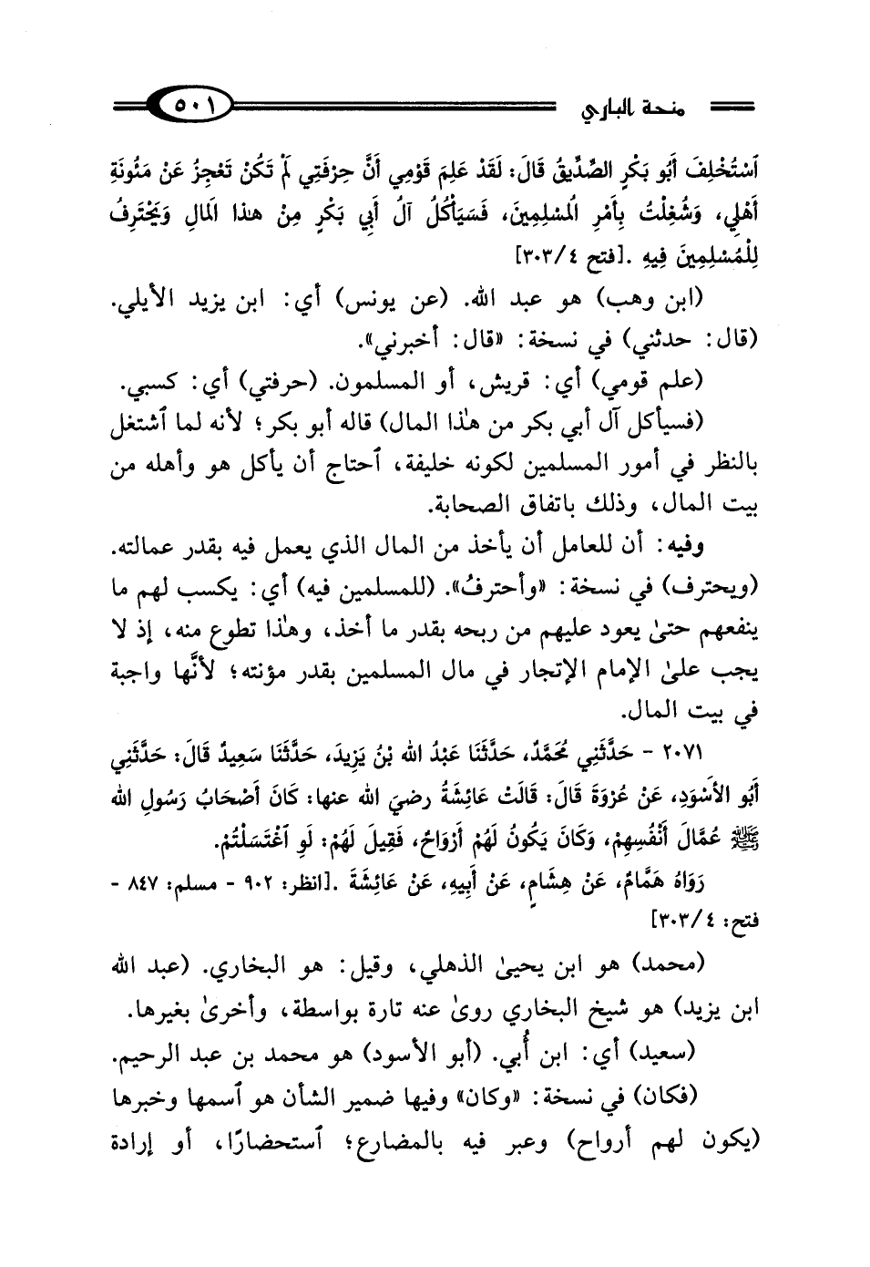 2071 - حَدَّثَنِي مُحَمَّدٌ، حَدَّثَنَا عَبْدُ اللَّهِ بْنُ يَزِيدَ، حَدَّثَنَا سَعِيدٌ، قَال: حَدَّثَنِي أَبُو الأَسْوَدِ، عَنْ عُرْوَةَ، قَال: قَالتْ عَائِشَةُ رَضِيَ اللَّهُ عَنْهَا: كَانَ أَصْحَابُ رَسُولِ اللَّهِ صَلَّى اللهُ عَلَيْهِ وَسَلَّمَ عُمَّال أَنْفُسِهِمْ، وَكَانَ يَكُونُ لَهُمْ أَرْوَاحٌ، فَقِيلَ لَهُمْ: "لَو اغْتَسَلْتُمْ"، رَوَاهُ هَمَّامٌ، عَنْ هِشَامٍ، عَنْ أَبِيهِ، عَنْ عَائِشَةَ.
