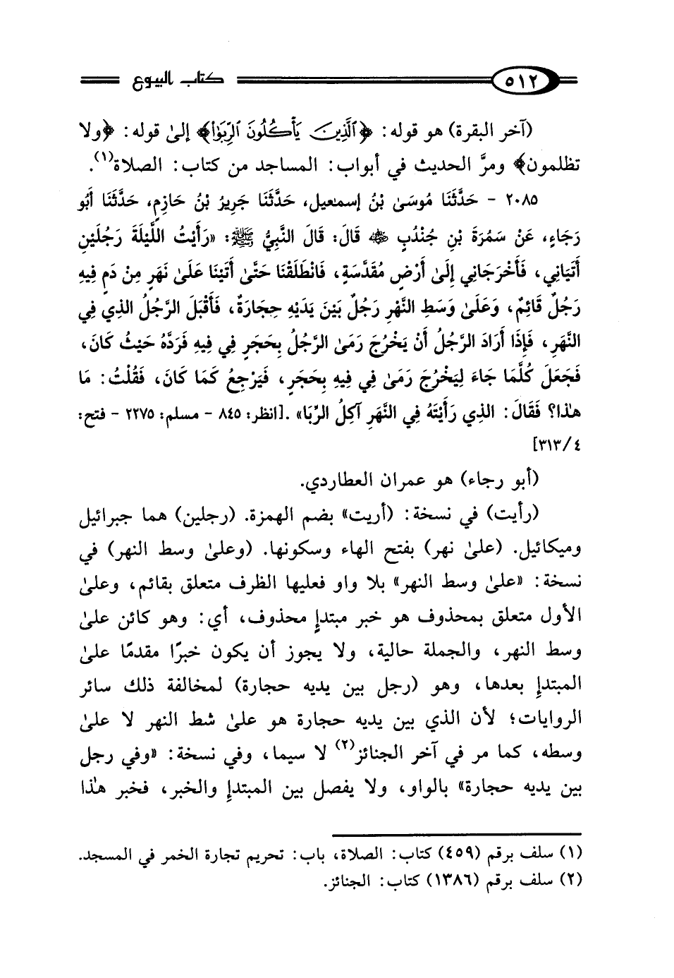 2085 - حَدَّثَنَا مُوسَى بْنُ إِسْمَاعِيلَ، حَدَّثَنَا جَرِيرُ بْنُ حَازِمٍ، حَدَّثَنَا أَبُو رَجَاءٍ، عَنْ سَمُرَةَ بْنِ جُنْدُبٍ رَضِيَ اللَّهُ عَنْهُ، قَال: قَال النَّبِيُّ صَلَّى اللهُ عَلَيْهِ وَسَلَّمَ: "رَأَيْتُ اللَّيْلَةَ رَجُلَيْنِ أَتَيَانِي، فَأَخْرَجَانِي إِلَى أَرْضٍ مُقَدَّسَةٍ، فَانْطَلَقْنَا حَتَّى أَتَيْنَا عَلَى نَهَرٍ مِنْ دَمٍ فِيهِ رَجُلٌ قَائِمٌ وَعَلَى وَسَطِ النَّهَرِ رَجُلٌ بَيْنَ يَدَيْهِ حِجَارَةٌ، فَأَقْبَلَ الرَّجُلُ الَّذِي فِي النَّهَرِ، فَإِذَا أَرَادَ الرَّجُلُ أَنْ يَخْرُجَ رَمَى الرَّجُلُ بِحَجَرٍ فِي فِيهِ، فَرَدَّهُ حَيْثُ كَانَ، فَجَعَلَ كُلَّمَا جَاءَ لِيَخْرُجَ رَمَى فِي فِيهِ بِحَجَرٍ، فَيَرْجِعُ كَمَا كَانَ، فَقُلْتُ مَا هَذَا؟ فَقَال: الَّذِي رَأَيْتَهُ فِي النَّهَرِ آكِلُ الرِّبَا".
