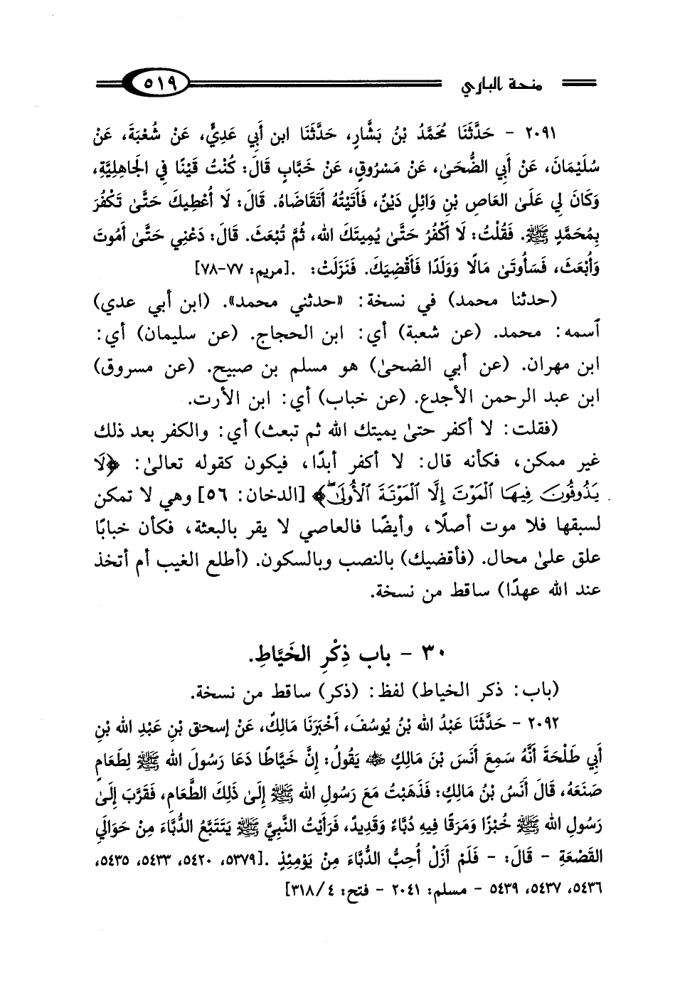 2091 - حَدَّثَنَا مُحَمَّدُ بْنُ بَشَّارٍ، حَدَّثَنَا ابْنُ أَبِي عَدِيٍّ، عَنْ شُعْبَةَ، عَنْ سُلَيْمَانَ، عَنْ أَبِي الضُّحَى، عَنْ مَسْرُوقٍ، عَنْ خَبَّابٍ، قَال: كُنْتُ قَيْنًا فِي الجَاهِلِيَّةِ، وَكَانَ لِي عَلَى العَاصِ بْنِ وَائِلٍ دَيْنٌ، فَأَتَيْتُهُ أَتَقَاضَاهُ، قَال: لَا أُعْطِيكَ حَتَّى تَكْفُرَ بِمُحَمَّدٍ صَلَّى اللهُ عَلَيْهِ وَسَلَّمَ، فَقُلْتُ: "لَا أَكْفُرُ حَتَّى يُمِيتَكَ اللَّهُ، ثُمَّ تُبْعَثَ"، قَال: دَعْنِي حَتَّى أَمُوتَ وَأُبْعَثَ، فَسَأُوتَى مَالًا وَوَلَدًا فَأَقْضِيكَ، فَنَزَلَتْ: [مريم: 77 - 78]