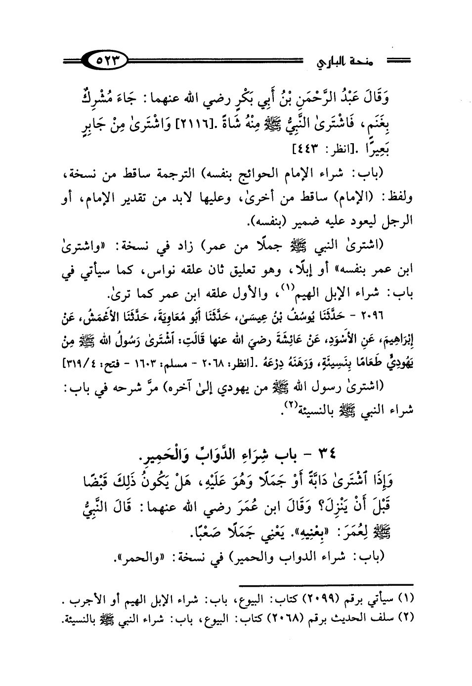 (اشترى النَّبيّ - صلى الله عليه وسلم - جملًا من عمر) زاد في نسخة: "واشترى ابن عمر بنفسه" أو إبلًا، وهو تعليق ثان علقه نواس، كما سيأتي في باب: شراء الإبل الهيم (¬1)، والأول علقه ابن عمر كما ترى.