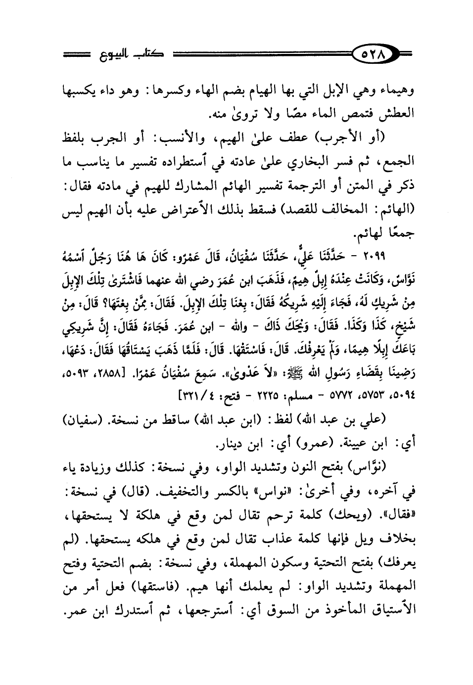 2099 - حَدَّثَنَا عَلِيُّ بْنُ عَبْدِ اللَّهِ، حَدَّثَنَا سُفْيَانُ، قَال: قَال عَمْرٌو: كَانَ هَا هُنَا رَجُلٌ اسْمُهُ نَوَّاسٌ وَكَانَتْ عِنْدَهُ إِبِلٌ هِيمٌ، فَذَهَبَ ابْنُ عُمَرَ رَضِيَ اللَّهُ عَنْهُمَا، فَاشْتَرَى تِلْكَ الإِبِلَ مِنْ شَرِيكٍ لَهُ، فَجَاءَ إِلَيْهِ شَرِيكُهُ، فَقَال: بِعْنَا تِلْكَ الإِبِلَ فَقَال: مِمَّنْ بِعْتَهَا؟ قَال: مِنْ شَيْخٍ كَذَا وَكَذَا، فَقَال: وَيْحَكَ، ذَاكَ وَاللَّهِ ابْنُ عُمَرَ، فَجَاءَهُ فَقَال: إِنَّ شَرِيكِي بَاعَكَ إِبِلًا هِيمًا، وَلَمْ يَعْرِفْكَ قَال: فَاسْتَقْهَا، قَال: فَلَمَّا ذَهَبَ يَسْتَاقُهَا، فَقَال: دَعْهَا، رَضِينَا بِقَضَاءِ رَسُولِ اللَّهِ صَلَّى اللهُ عَلَيْهِ وَسَلَّمَ: "لَا عَدْوَى"، سَمِعَ سُفْيَانُ عَمْرًا.