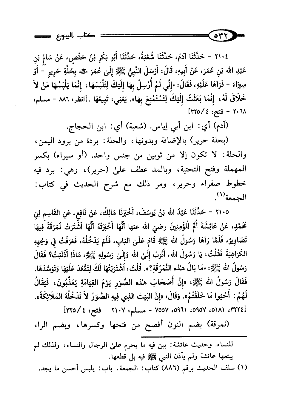 2104 - حَدَّثَنَا آدَمُ، حَدَّثَنَا شُعْبَةُ، حَدَّثَنَا أَبُو بَكْرِ بْنُ حَفْصٍ، عَنْ سَالِمِ بْنِ عَبْدِ اللَّهِ بْنِ عُمَرَ، عَنْ أَبِيهِ، قَال: أَرْسَلَ النَّبِيُّ صَلَّى اللهُ عَلَيْهِ وَسَلَّمَ إِلَى عُمَرَ رَضِيَ اللَّهُ عَنْهُ بِحُلَّةِ حَرِيرٍ، أَوْ سِيَرَاءَ، فَرَآهَا عَلَيْهِ فَقَال: "إِنِّي لَمْ أُرْسِلْ بِهَا إِلَيْكَ لِتَلْبَسَهَا، إِنَّمَا يَلْبَسُهَا مَنْ لَا خَلاقَ لَهُ، إِنَّمَا بَعَثْتُ إِلَيْكَ لِتَسْتَمْتِعَ بِهَا" يَعْنِي تَبِيعَهَا [انظر: 886 - مسلم: 2068 - فتح: 4/ 335]