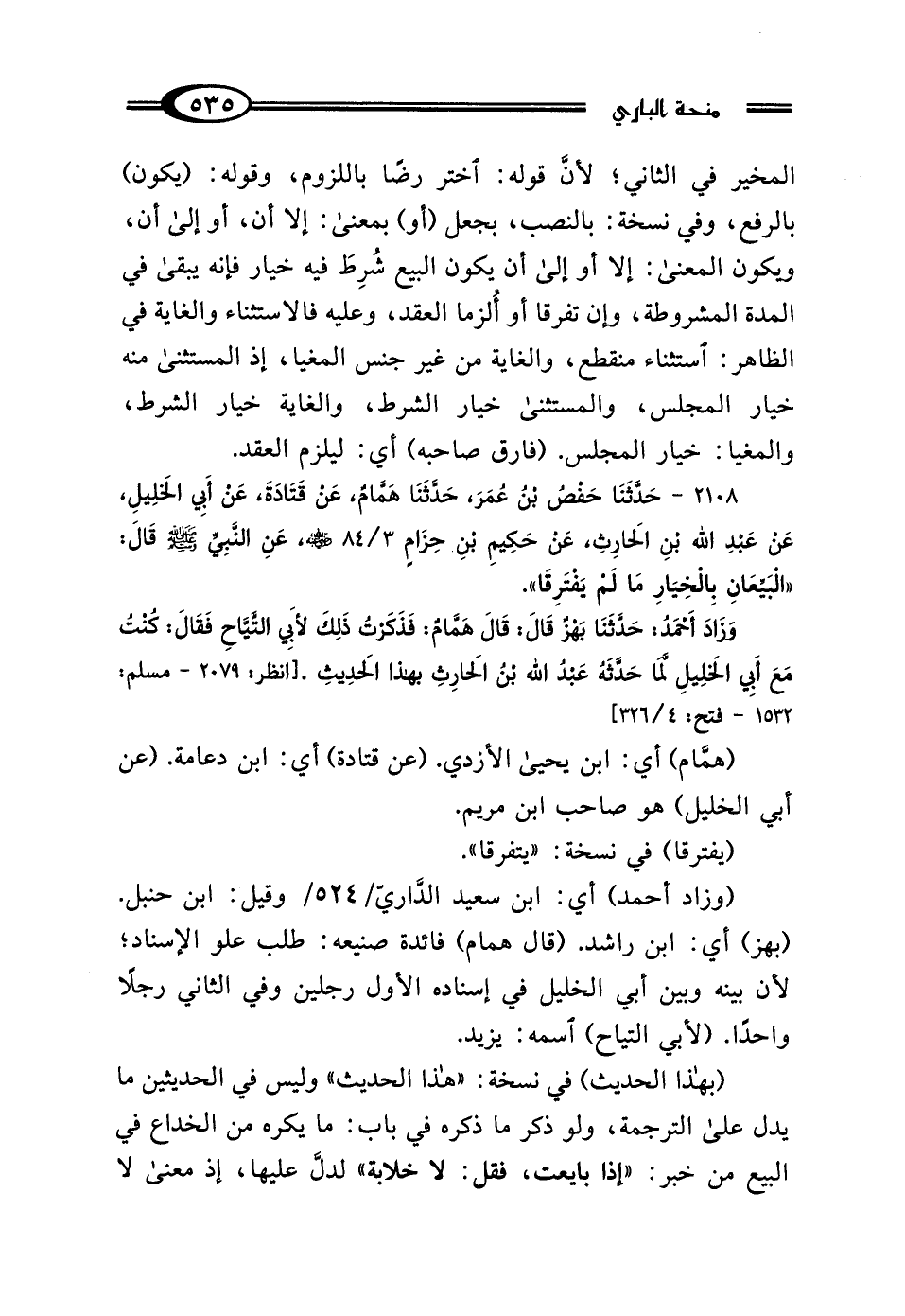 2108 - حَدَّثَنَا حَفْصُ بْنُ عُمَرَ، حَدَّثَنَا هَمَّامٌ، عَنْ قَتَادَةَ، عَنْ أَبِي الخَلِيلِ، عَنْ عَبْدِ اللَّهِ بْنِ الحَارِثِ، عَنْ حَكِيمِ بْنِ حِزَامٍ رَضِيَ اللَّهُ عَنْهُ، عَنِ النَّبِيِّ صَلَّى اللهُ عَلَيْهِ وَسَلَّمَ، قَال: "البَيِّعَانِ بِالخِيَارِ مَا لَمْ يَفْتَرِقَا" وَزَادَ أَحْمَدُ، حَدَّثَنَا بَهْزٌ قَال: قَال هَمَّامٌ: فَذَكَرْتُ ذَلِكَ لِأَبِي التَّيَّاحِ، فَقَال: كُنْتُ مَعَ أَبِي الخَلِيلِ، لَمَّا حَدَّثَهُ عَبْدُ اللَّهِ بْنُ الحَارِثِ بِهَذَا الحَدِيثِ.
