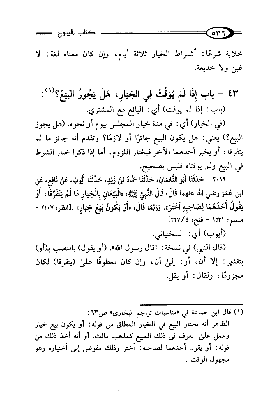 43 - بَابُ إِذَا لَمْ يُوَقِّتْ فِي الخِيَارِ، هَلْ يَجُوزُ البَيْعُ؟ (¬1):