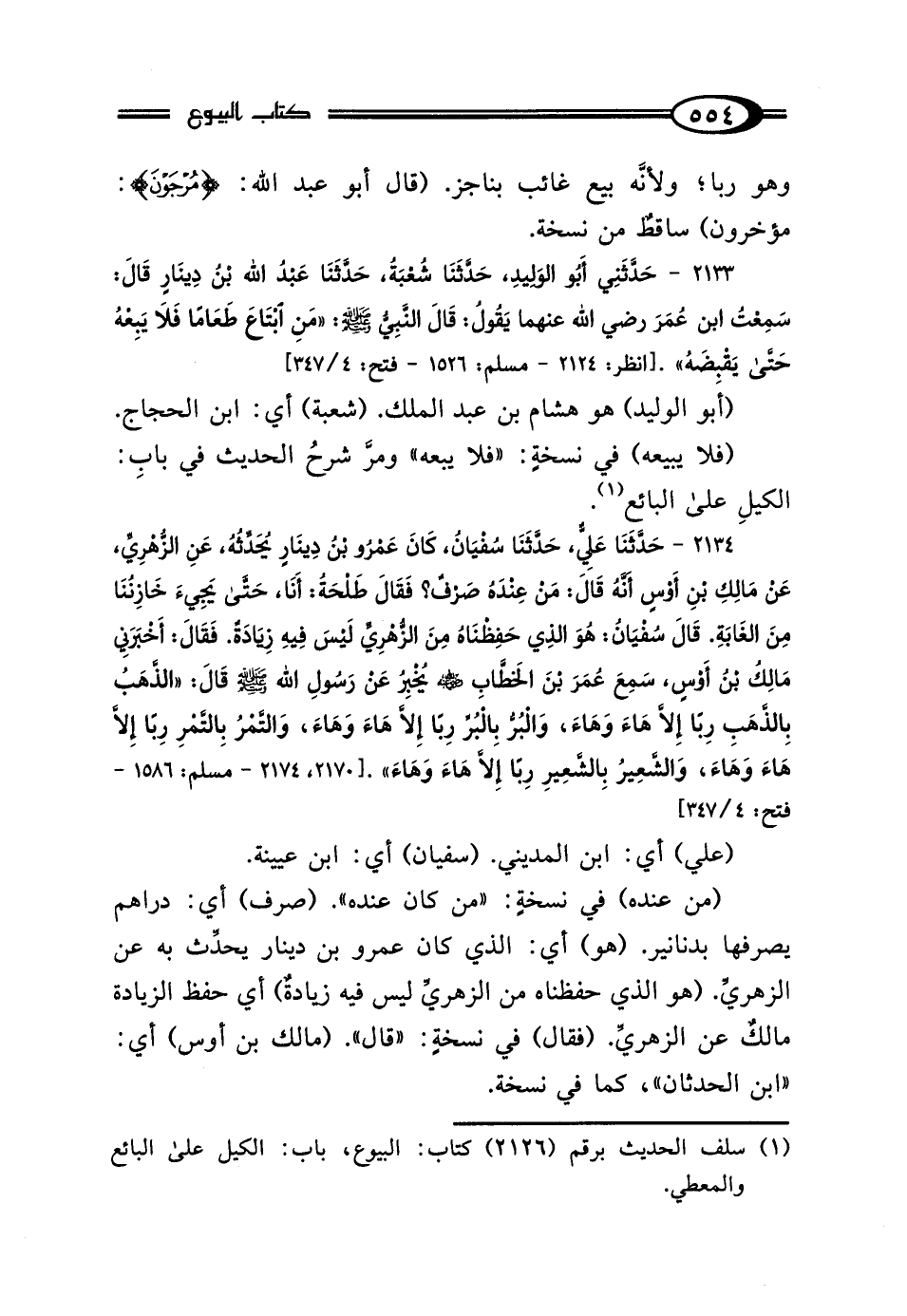 2133 - حَدَّثَنِي أَبُو الوَلِيدِ، حَدَّثَنَا شُعْبَةُ، حَدَّثَنَا عَبْدُ اللَّهِ بْنُ دِينَارٍ، قَال: سَمِعْتُ ابْنَ عُمَرَ رَضِيَ اللَّهُ عَنْهُمَا، يَقُولُ: قَال النَّبِيُّ صَلَّى اللهُ عَلَيْهِ وَسَلَّمَ: "مَنِ ابْتَاعَ طَعَامًا فَلَا يَبِعْهُ حَتَّى يَقْبِضَهُ".