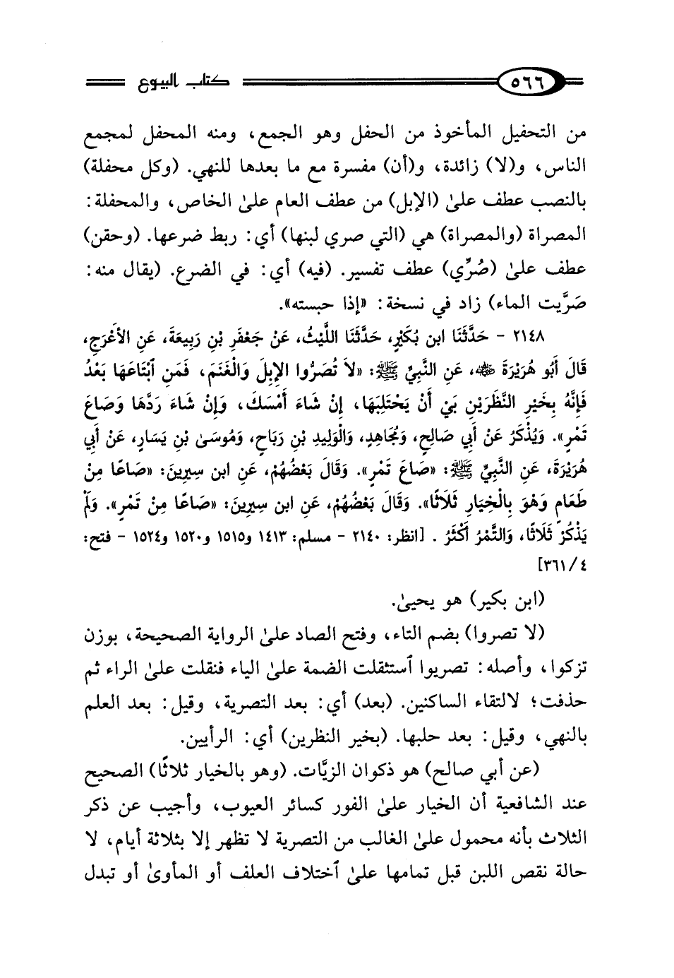 (لا تصروا) بضم التاء، وفتح الصاد على الرواية الصحيحة، بوزن تزكوا، وأصله: تصريوا استثقلت الضمة على الياء فنقلت على الراء ثم حذفت؛ لالتقاء الساكنين. (بعد) أي: بعد التصرية، وقيل: بعد العلم بالنهي، وقيل: بعد حلبها. (بخير النظرين) أي: الرأيين.