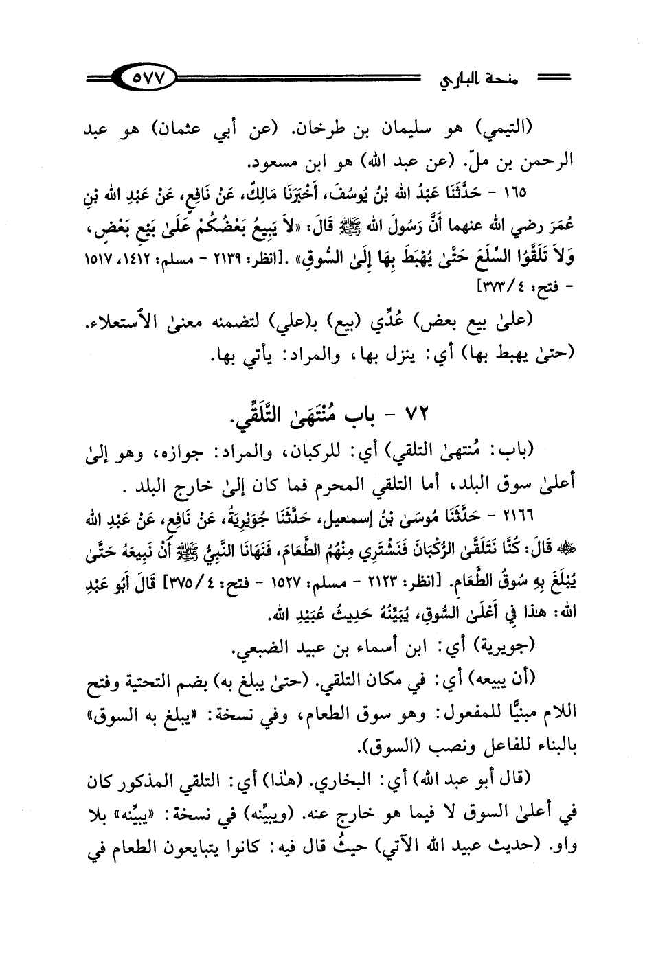 2165 - حَدَّثَنَا عَبْدُ اللَّهِ بْنُ يُوسُفَ، أَخْبَرَنَا مَالِكٌ، عَنْ نَافِعٍ، عَنْ عَبْدِ اللَّهِ بْنِ عُمَرَ رَضِيَ اللَّهُ عَنْهُمَا، أَنَّ رَسُولَ اللَّهِ صَلَّى اللهُ عَلَيْهِ وَسَلَّمَ، قَال: "لَا يَبِيعُ بَعْضُكُمْ عَلَى بَيْعِ بَعْضٍ، وَلَا تَلَقَّوْا السِّلَعَ حَتَّى يُهْبَطَ بِهَا إِلَى السُّوقِ".