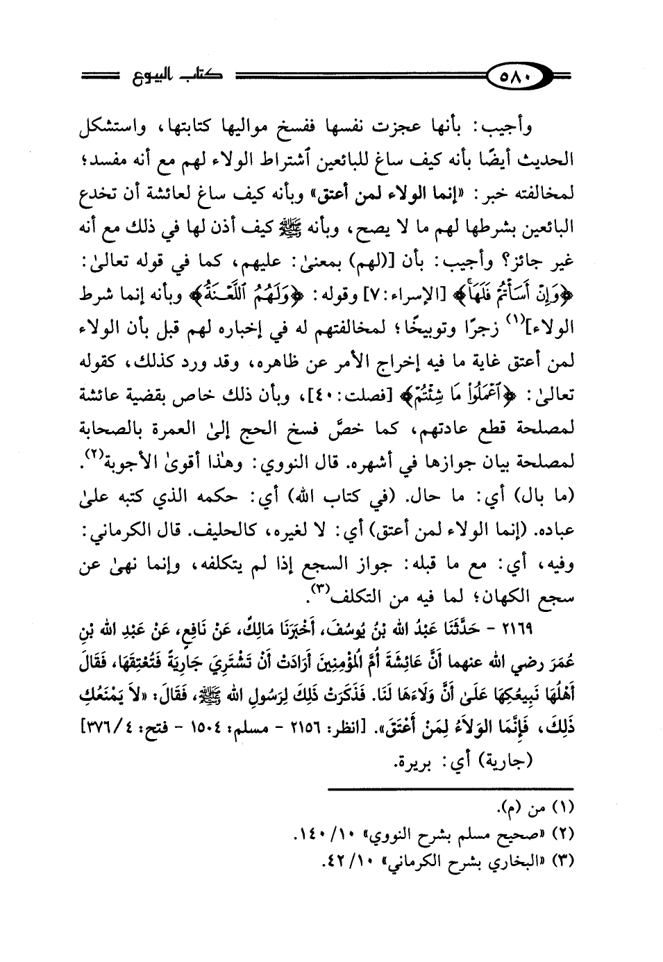 وأجيب: بأنها عجزت نفسها ففسخ مواليها كتابتها، واستشكل الحديث أيضًا بأنه كيف ساغ للبائعين اشتراط الولاء لهم مع أنه مفسد؛ لمخالفته خبر: "إنما الولاء لمن أعتق" وبأنه كيف ساغ لعائشة أن تخدع البائعين بشرطها لهم ما لا يصح، وبأنه - صلى الله عليه وسلم - كيف أذن لها في ذلك مع أنه غير جائز؟ وأجيب: بأن [(لهم) بمعنى: عليهم، كما في قوله تعالى: {وَإِنْ أَسَأْتُمْ فَلَهَا} [الإسراء: 7] وقوله {وَلَهُمُ اللَّعْنَةُ} وبأنه إنما شرط الولاء] (¬1) زجرًا وتوبيخًا؛ لمخالفتهم له في إخباره لهم قبل بأن الولاء لمن أعتق غاية ما فيه إخراج الأمر عن ظاهره، وقد ورد كذلك، كقوله تعالى: {اعْمَلُوا مَا شِئْتُمْ} [فصلت: 40]، وبأن ذلك خاص بقضية عائشة لمصلحة قطع عادتهم، كما خصَّ فسخ الحج إلى العمرة بالصحابة لمصلحة بيان جوازها في أشهره. قال النووي: وهذا أقوى الأجوبة (¬2).