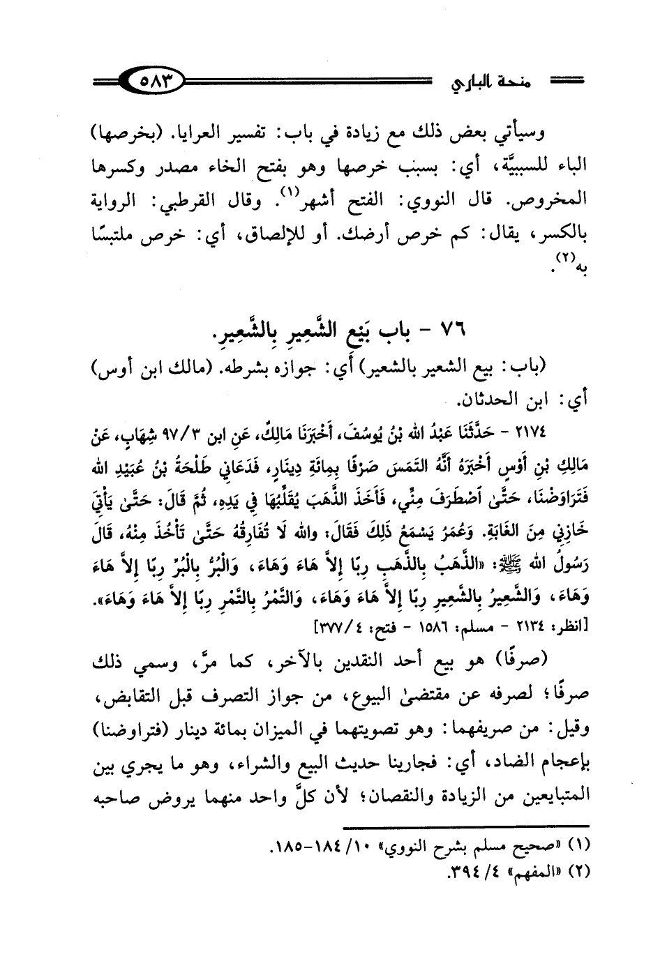 [انظر: 2134 - مسلم: 1586 - فتح: 4/ 377] (صرفًا) هو بيع أحد النقدين بالآخر، كما مرَّ، وسمي ذلك صرفًا؛ لصرفه عن مقتضى البيوع، من جواز التصرف قبل التقابض، وقيل: من صريفهما: وهو تصويتهما في الميزان بمائة دينار (فتراوضنا) بإعجام الضاد، أي: فجارينا حديث البيع والشراء، وهو ما يجري بين المتبايعين من الزيادة والنقصان؛ لأن كلَّ واحد منهما يروض صاحبه