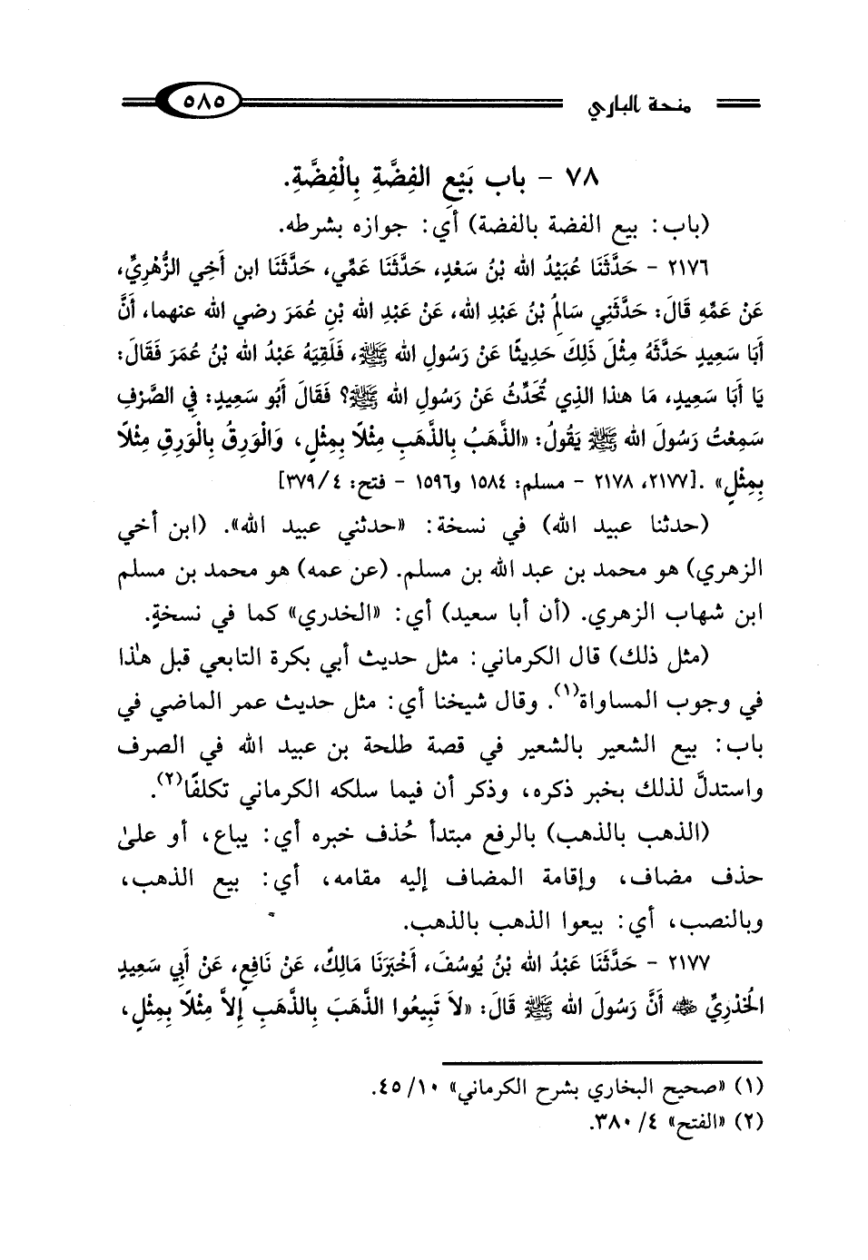 2176 - حَدَّثَنَا عُبَيْدُ اللَّهِ بْنُ سَعْدٍ، حَدَّثَنَا عَمِّي، حَدَّثَنَا ابْنُ أَخِي الزُّهْرِيِّ، عَنْ عَمِّهِ قَال: حَدَّثَنِي سَالِمُ بْنُ عَبْدِ اللَّهِ، عَنْ عَبْدِ اللَّهِ بْنِ عُمَرَ رَضِيَ اللَّهُ عَنْهُمَا، أَنَّ أَبَا سَعِيدٍ الخُدْرِيَّ حَدَّثَهُ مِثْلَ ذَلِكَ حَدِيثًا، عَنْ رَسُولِ اللَّهِ صَلَّى اللهُ عَلَيْهِ وَسَلَّمَ: فَلَقِيَهُ عَبْدُ اللَّهِ بْنُ عُمَرَ فَقَال: يَا أَبَا سَعِيدٍ مَا هَذَا الَّذِي تُحَدِّثُ عَنْ رَسُولِ اللَّهِ صَلَّى اللهُ عَلَيْهِ وَسَلَّمَ؟ فَقَال أَبُو سَعِيدٍ: فِي الصَّرْفِ سَمِعْتُ رَسُولَ اللَّهِ صَلَّى اللهُ عَلَيْهِ وَسَلَّمَ يَقُولُ: "الذَّهَبُ بِالذَّهَبِ مِثْلًا بِمِثْلٍ، وَالوَرِقُ بِالوَرِقِ مِثْلًا بِمِثْلٍ".
