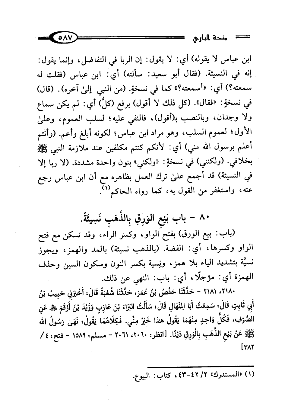 ابن عباس لا يقوله) أي: لا يقول: إن الربا في التفاضل، وإنما يقول: إنه في النسيئة. (فقال أبو سعيد: سألته) أي: ابن عباس (فقلت له سمعته؟) أي: "أسمعته؟ " كما في نسخةٍ. (من النبي إلى آخره). (قال) في نسخةٍ: "فقال". (كل ذلك لا أقول) برفع (كلُّ) أي: لم يكن سماع ولا وجدان، وبالنصب بـ (أقول)، فالنفي عليه؛ لسلب العموم، وعلى الأول؛ لعموم السلب، وهو مراد ابن عباس؛ لكونه أبلغ وأعم. (وأنتم أعلم برسول الله مني) أي: لأنكم كنتم مكلفين عند ملازمة النبي - صلى الله عليه وسلم - بخلافي. (ولكنني) في نسخةٍ: "ولكني" بنون واحدة مشددة (لا ربا إلا في النسيئة) قد أجمع على ترك العمل بظاهره مع أن ابن عباس رجع عنه، واستغفر من القول به، كما رواه الحاكم (¬1).