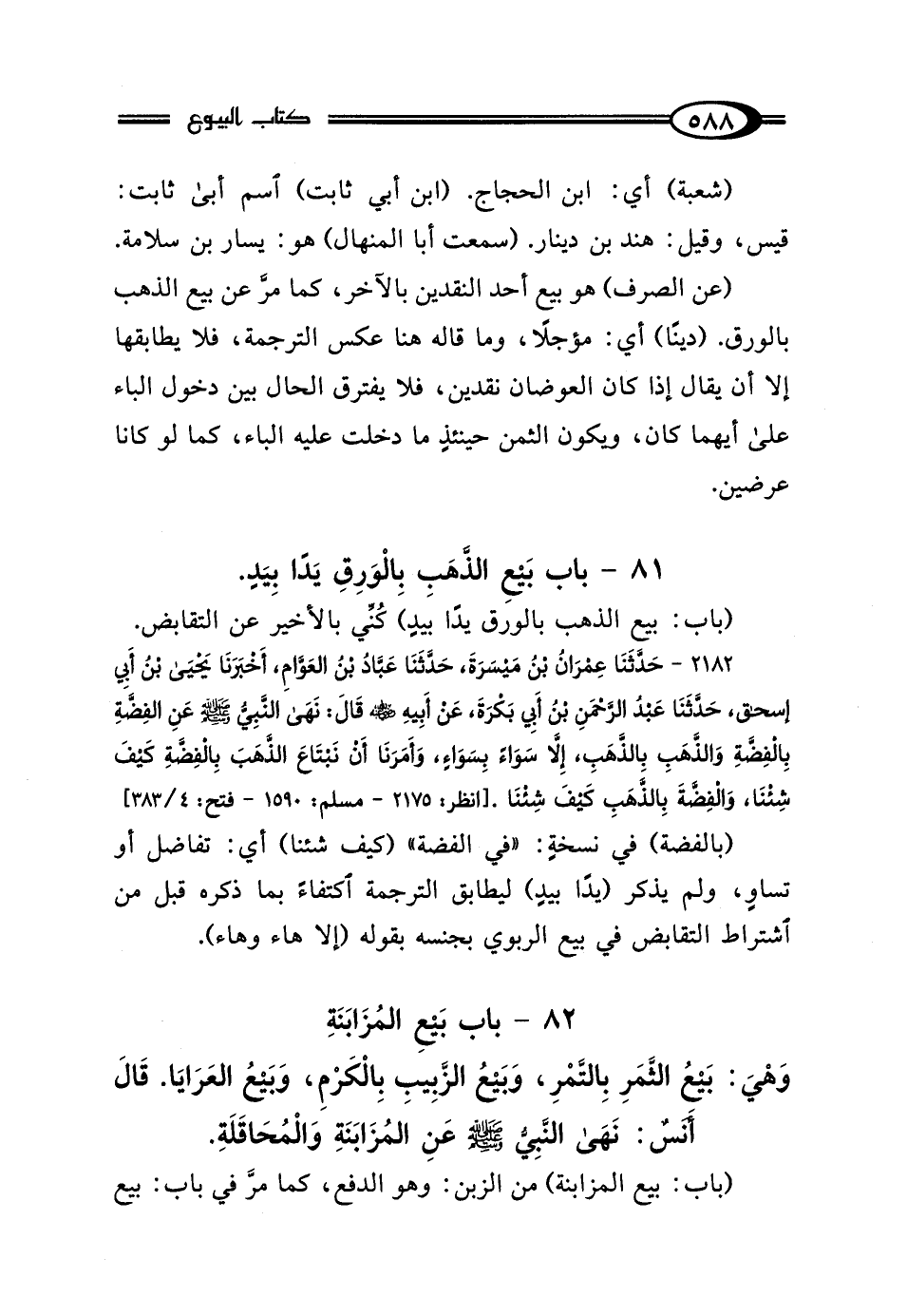 (باب: بيع الذهب بالورق يدًا بيدٍ) كُنِّي بالأخير عن التقابض.