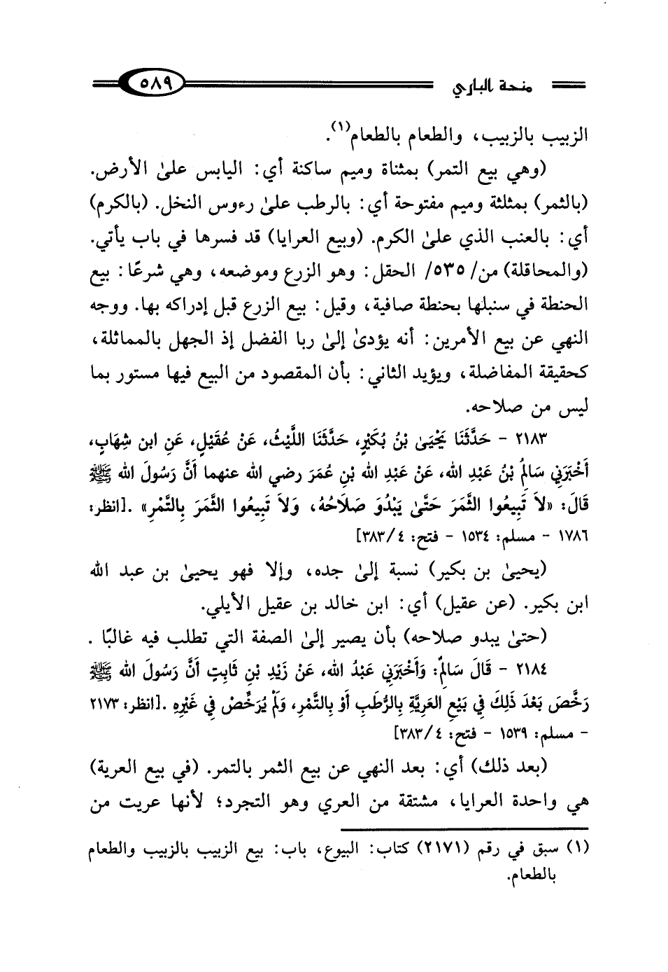 2183 - حَدَّثَنَا يَحْيَى بْنُ بُكَيْرٍ، حَدَّثَنَا اللَّيْثُ، عَنْ عُقَيْلٍ، عَنِ ابْنِ شِهَابٍ، أَخْبَرَنِي سَالِمُ بْنُ عَبْدِ اللَّهِ، عَنْ عَبْدِ اللَّهِ بْنِ عُمَرَ رَضِيَ اللَّهُ عَنْهُمَا: أَنَّ رَسُولَ اللَّهِ صَلَّى اللهُ عَلَيْهِ وَسَلَّمَ، قَال: "لَا تَبِيعُوا الثَّمَرَ حَتَّى يَبْدُوَ صَلاحُهُ، وَلَا تَبِيعُوا الثَّمَرَ بِالتَّمْرِ".