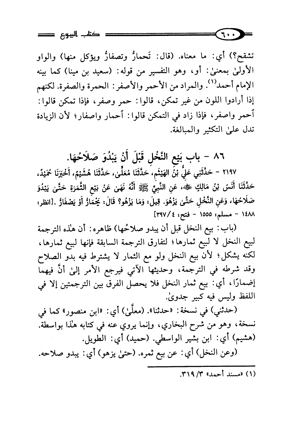 2197 - حَدَّثَنِي عَلِيُّ بْنُ الهَيْثَمِ، حَدَّثَنَا مُعَلَّى بْنُ مَنْصُورٍ الرَّازِيُّ، حَدَّثَنَا هُشَيْمٌ، أَخْبَرَنَا حُمَيْدٌ، حَدَّثَنَا أَنَسُ بْنُ مَالِكٍ رَضِيَ اللَّهُ عَنْهُ، عَنِ النَّبِيِّ صَلَّى اللهُ عَلَيْهِ وَسَلَّمَ: "أَنَّهُ نَهَى عَنْ بَيْعِ الثَّمَرَةِ حَتَّى يَبْدُوَ صَلاحُهَا، وَعَنِ النَّخْلِ حَتَّى يَزْهُوَ"، قِيلَ: وَمَا يَزْهُو؟ قَال: "يَحْمَارُّ أَوْ يَصْفَارُّ".