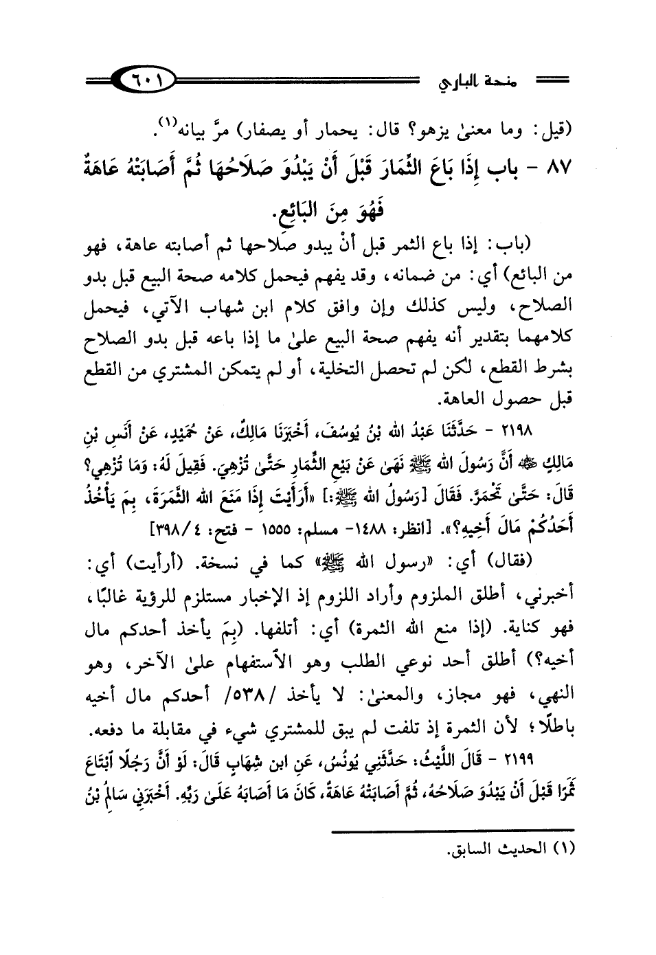 2198 - حَدَّثَنَا عَبْدُ اللَّهِ بْنُ يُوسُفَ: أَخْبَرَنَا مَالِكٌ، عَنْ حُمَيْدٍ، عَنْ أَنَسِ بْنِ مَالِكٍ رَضِيَ اللَّهُ عَنْهُ، أَنَّ رَسُولَ اللَّهِ صَلَّى اللهُ عَلَيْهِ وَسَلَّمَ نَهَى عَنْ بَيْعِ الثِّمَارِ حَتَّى تُزْهِيَ، فَقِيلَ لَهُ: وَمَا تُزْهِي؟ قَال: حَتَّى تَحْمَرَّ. فَقَال رَسُولُ اللَّهِ صَلَّى اللهُ عَلَيْهِ وَسَلَّمَ: "أَرَأَيْتَ إِذَا مَنَعَ اللَّهُ الثَّمَرَةَ، بِمَ يَأْخُذُ أَحَدُكُمْ مَال أَخِيهِ؟ ".
