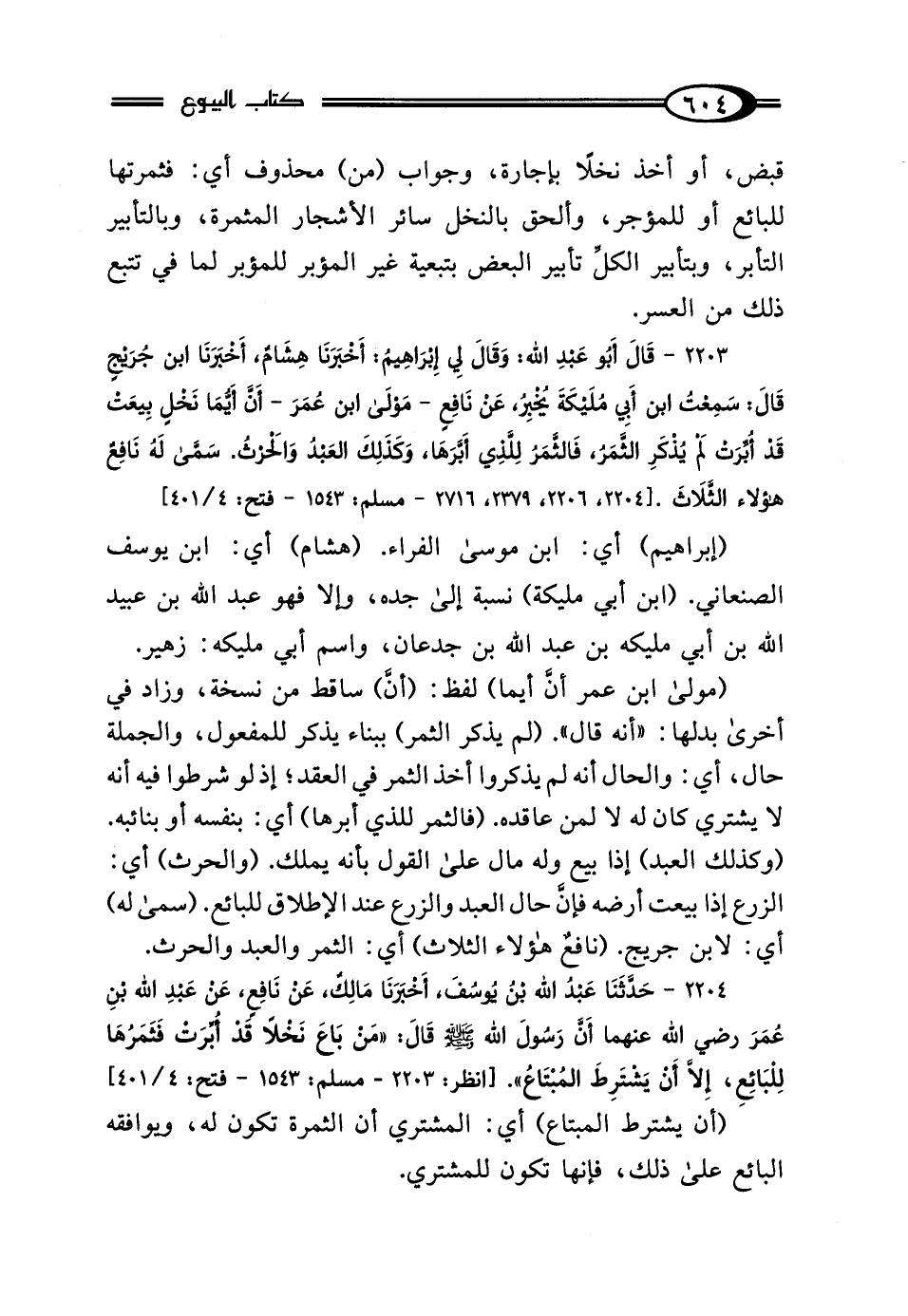 2203 - قَال أَبُو عَبْدِ اللَّهِ: وقَال لِي إِبْرَاهِيمُ: أَخْبَرَنَا هِشَامٌ، أَخْبَرَنَا ابْنُ جُرَيْجٍ، قَال: سَمِعْتُ ابْنَ أَبِي مُلَيْكَةَ، يُخْبِرُ عَنْ نَافِعٍ، مَوْلَى ابْنِ عُمَرَ، أَنَّهُ قَال: "أَيُّمَا نَخْلٍ بِيعَتْ، قَدْ أُبِّرَتْ لَمْ يُذْكَرِ الثَّمَرُ، فَالثَّمَرُ لِلَّذِي أَبَّرَهَا، وَكَذَلِكَ العَبْدُ، وَالحَرْثُ"، سَمَّى لَهُ نَافِعٌ هَؤُلاءِ الثَّلاثَ.