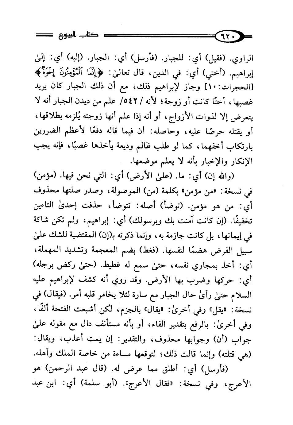 (والله إن) أي: ما. (على الأرض) أي: التي نحن فيها. (مؤمن) في نسخة: "من مؤمن" بكلمة (من) الموصولة، وصدر صلتها محذوف أي: من هو مؤمن. (توضأ) أصله: تتوضأ، حذفت إحدى التاءين تخفيفًا. (إن كانت آمنت بك وبرسولك) أي: إبراهيم، ولم تكن شاكة في إيمانها، بل كانت جازمة به، وإنما ذكرته بـ (إن) المقتضية للشك على سبيل الفرض هضمًا لنفسها. (فغط) بضم المعجمة وتشديد المهملة، أي: أخذ بمجاري نفسه، حتى سمع له غطيط. (حتى ركض برجله) أي: حركها وضرب بها الأرض. وقد روي أنه كشف لإبراهيم عليه السلام حتى رأى حال الجبار مع سارة لئلا يخامر قلبه أمر. (فيقال) في نسخة: "يقل" وفي أخرى: "يقال" بالجزم، لكن أشبعت الفتحة ألفًا، وفي أخرى: بالرفع بتقدير الفاء، أو بأنه مستأنف دال مع مقوله على جواب (أن) وجوابها محذوف، والتقدير: إن يمت أعذب، ويقال: (هي قتلته) وإنما قالت ذلك؛ لتوقعها مساءة من خاصة الملك وأهله.