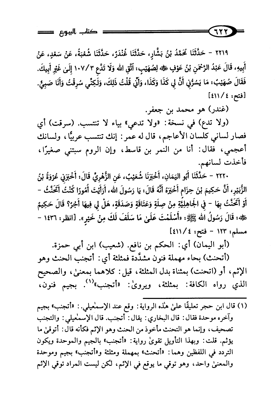 2219 - حَدَّثَنَا مُحَمَّدُ بْنُ بَشَّارٍ، حَدَّثَنَا غُنْدَرٌ، حَدَّثَنَا شُعْبَةُ، عَنْ سَعْدٍ، عَنْ أَبِيهِ، قَال عَبْدُ الرَّحْمَنِ بْنُ عَوْفٍ رَضِيَ اللَّهُ عَنْهُ لِصُهَيْبٍ: اتَّقِ اللَّهَ وَلَا تَدَّعِ إِلَى غَيْرِ أَبِيكَ، فَقَال صُهَيْبٌ "مَا يَسُرُّنِي أَنَّ لِي كَذَا وَكَذَا، وَأَنِّي قُلْتُ ذَلِكَ وَلَكِنِّي سُرِقْتُ وَأَنَا صَبِيٌّ".