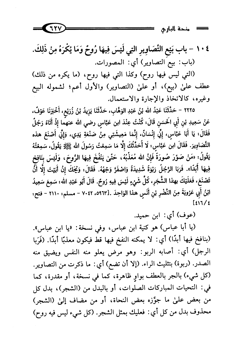 2225 - حَدَّثَنَا عَبْدُ اللَّهِ بْنُ عَبْدِ الوَهَّابِ، حَدَّثَنَا يَزِيدُ بْنُ زُرَيْعٍ، أَخْبَرَنَا عَوْفٌ، عَنْ سَعِيدِ بْنِ أَبِي الحَسَنِ، قَال: كُنْتُ عِنْدَ ابْنِ عَبَّاسٍ رَضِيَ اللَّهُ عَنْهُمَا، إِذْ أَتَاهُ رَجُلٌ فَقَال: يَا أَبَا عَبَّاسٍ، إِنِّي إِنْسَانٌ إِنَّمَا مَعِيشَتِي مِنْ صَنْعَةِ يَدِي، وَإِنِّي أَصْنَعُ هَذِهِ التَّصَاويرَ، فَقَال ابْنُ عَبَّاسٍ: لَا أُحَدِّثُكَ إلا مَا سَمِعْتُ رَسُولَ اللَّهِ صَلَّى اللهُ عَلَيْهِ وَسَلَّمَ يَقُولُ: سَمِعْتُهُ يَقُولُ: "مَنْ صَوَّرَ صُورَةً، فَإِنَّ اللَّهَ مُعَذِّبُهُ حَتَّى يَنْفُخَ فِيهَا الرُّوحَ، وَلَيْسَ بِنَافِخٍ فِيهَا أَبَدًا" فَرَبَا الرَّجُلُ رَبْوَةً شَدِيدَةً، وَاصْفَرَّ وَجْهُهُ، فَقَال: وَيْحَكَ، إِنْ أَبَيْتَ إلا أَنْ تَصْنَعَ، فَعَلَيْكَ بِهَذَا الشَّجَرِ، كُلِّ شَيْءٍ لَيْسَ فِيهِ رُوحٌ، قَال أَبُو عَبْدِ اللَّهِ: سَمِعَ سَعِيدُ بْنُ أَبِي عَرُوبَةَ، مِنَ النَّضْرِ بْنِ أَنَسٍ، هَذَا الوَاحِدَ.