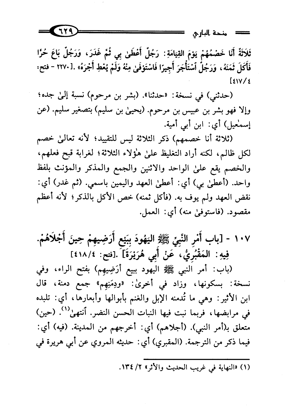 107 - بَابُ أَمْرِ النَّبِيِّ صَلَّى اللهُ عَلَيْهِ وَسَلَّمَ اليَهُودَ بِبَيْعِ أَرَضِيهِمْ حِينَ أَجْلاَهُمْ فِيهِ المَقْبُرِيُّ عَنْ أَبِي هُرَيْرَةَ [فتح: 4/ 418]