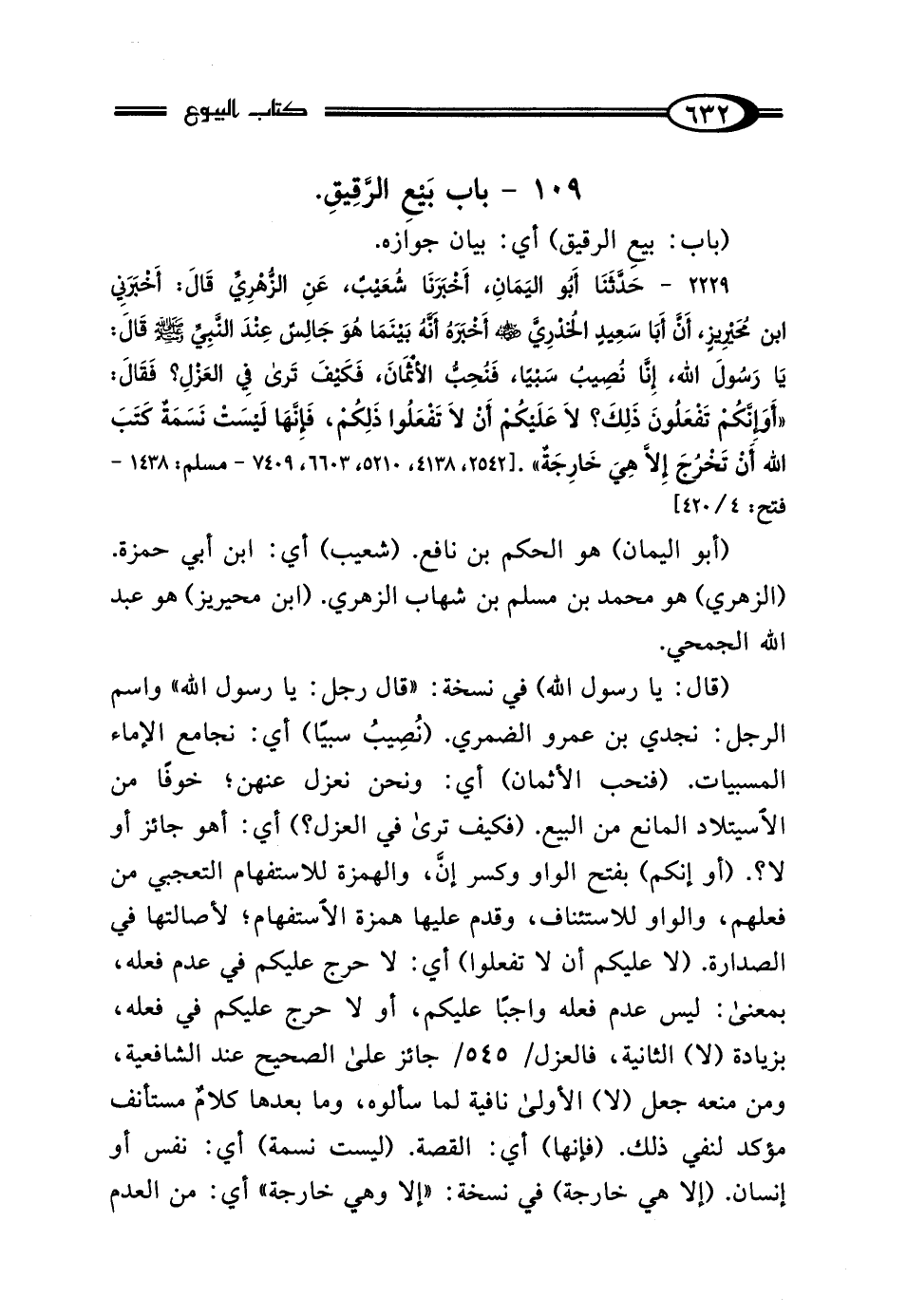 2229 - حَدَّثَنَا أَبُو اليَمَانِ، أَخْبَرَنَا شُعَيْبٌ، عَنِ الزُّهْرِيِّ، قَال: أَخْبَرَنِي ابْنُ مُحَيْرِيزٍ، أَنَّ أَبَا سَعِيدٍ الخُدْرِيَّ رَضِيَ اللَّهُ عَنْهُ، أَخْبَرَهُ: أَنَّهُ بَيْنَمَا هُوَ جَالِسٌ عِنْدَ النَّبِيِّ صَلَّى اللهُ عَلَيْهِ وَسَلَّمَ، قَال: يَا رَسُولَ اللَّهِ، إِنَّا نُصِيبُ سَبْيًا، فَنُحِبُّ الأَثْمَانَ، فَكَيْفَ تَرَى فِي العَزْلِ؟ فَقَال "أَوَإِنَّكُمْ تَفْعَلُونَ ذَلِكَ؟ لَا عَلَيْكُمْ أَنْ لَا تَفْعَلُوا ذَلِكُمْ، فَإِنَّهَا لَيْسَتْ نَسَمَةٌ كَتَبَ اللَّهُ أَنْ تَخْرُجَ إلا هِيَ خَارِجَةٌ".