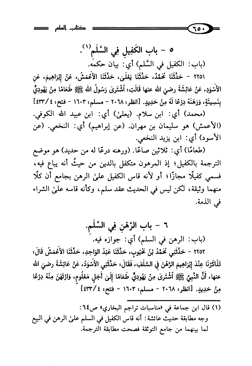 2251 - حَدَّثَنَا مُحَمَّدُ بْنُ سَلَّامٍ، حَدَّثَنَا يَعْلَى، حَدَّثَنَا الأَعْمَشُ، عَنْ إِبْرَاهِيمَ، عَنِ الأَسْوَدِ، عَنْ عَائِشَةَ رَضِيَ اللَّهُ عَنْهَا، قَالتْ: "اشْتَرَى رَسُولُ اللَّهِ صَلَّى اللهُ عَلَيْهِ وَسَلَّمَ طَعَامًا مِنْ يَهُودِيٍّ بِنَسِيئَةٍ، وَرَهَنَهُ دِرْعًا لَهُ مِنْ حَدِيدٍ".