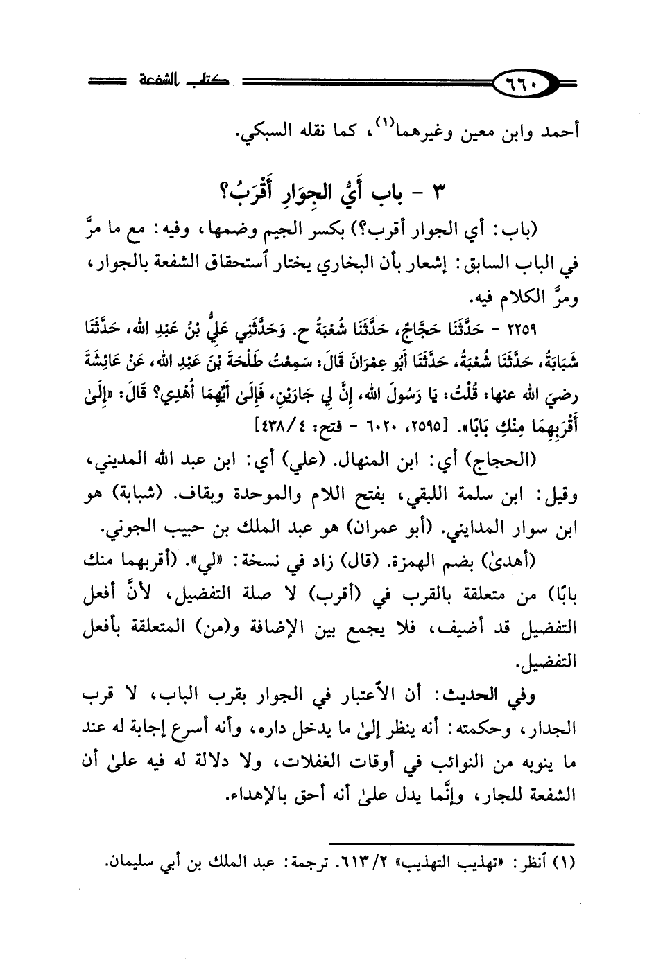 2259 - حَدَّثَنَا حَجَّاجٌ، حَدَّثَنَا شُعْبَةُ، ح وَحَدَّثَنِي عَلِيُّ بْنُ عَبْدِ اللَّهِ، حَدَّثَنَا شَبَابَةُ، حَدَّثَنَا شُعْبَةُ، حَدَّثَنَا أَبُو عِمْرَانَ، قَال: سَمِعْتُ طَلْحَةَ بْنَ عَبْدِ اللَّهِ، عَنْ عَائِشَةَ رَضِيَ اللَّهُ عَنْهَا، قُلْتُ: يَا رَسُولَ اللَّهِ، إِنَّ لِي جَارَيْنِ فَإِلَى أَيِّهِمَا أُهْدِي؟ قَال: "إِلَى أَقْرَبِهِمَا مِنْكِ بَابًا".