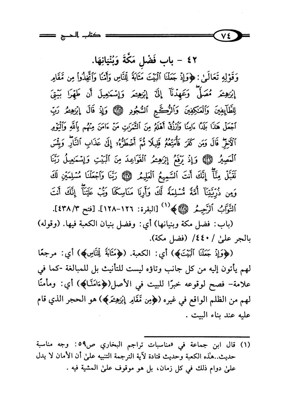 (¬1) قال ابن جماعة في "مناسبات تراجم البخاريّ ص 59: وجه مناسبة حديث .. هذه الكعبة وحديث قتادة لآية التّرجمة التنبيه على أن الأمان لا يدلُّ على دوام ذلك في كلّ زمان، بل هو موقوف على المشية فيه.