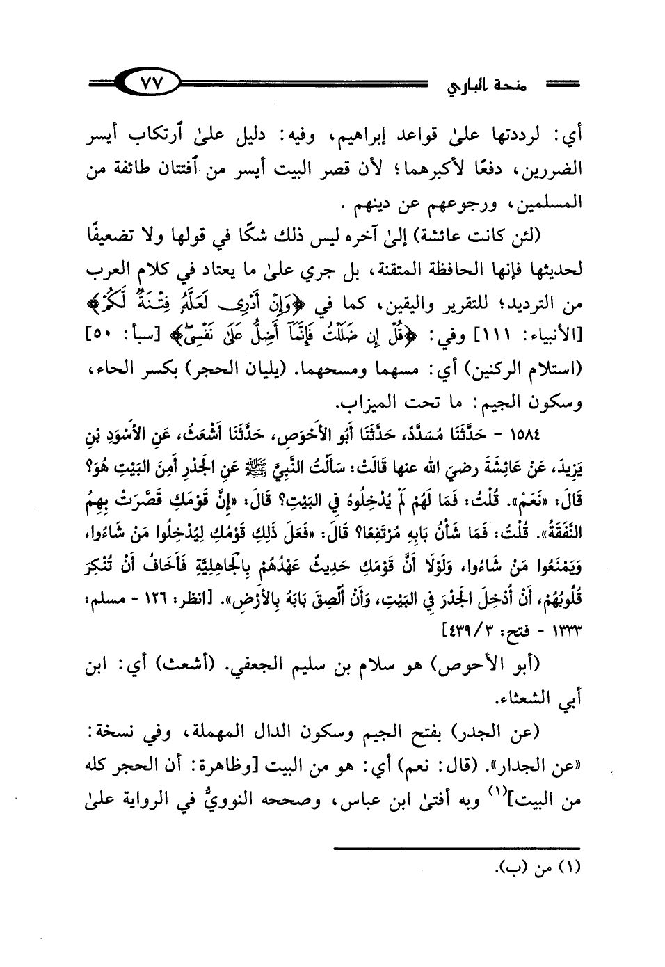 1584 - حَدَّثَنَا مُسَدَّدٌ، حَدَّثَنَا أَبُو الأَحْوَصِ، حَدَّثَنَا أَشْعَثُ، عَنِ الأَسْوَدِ بْنِ يَزِيدَ، عَنْ عَائِشَةَ رَضِيَ اللَّهُ عَنْهَا، قَالتْ: سَأَلْتُ النَّبِيَّ صَلَّى اللهُ عَلَيْهِ وَسَلَّمَ عَنْ الجَدْرِ أَمِنَ البَيْتِ هُوَ؟ قَال: "نَعَمْ" قُلْتُ: فَمَا لَهُمْ لَمْ يُدْخِلُوهُ فِي البَيْتِ؟ قَال: "إِنَّ قَوْمَكِ قَصَّرَتْ بِهِمُ النَّفَقَةُ" قُلْتُ: فَمَا شَأْنُ بَابِهِ مُرْتَفِعًا؟ قَال: "فَعَلَ ذَلِكَ قَوْمُكِ، لِيُدْخِلُوا مَنْ شَاءُوا وَيَمْنَعُوا مَنْ شَاءُوا، وَلَوْلا أَنَّ قَوْمَكِ حَدِيثٌ عَهْدُهُمْ بِالْجَاهِلِيَّةِ، فَأَخَافُ أَنْ تُنْكِرَ قُلُوبُهُمْ، أَنْ أُدْخِلَ الجَدْرَ فِي البَيْتِ، وَأَنْ أُلْصِقَ بَابَهُ بِالأَرْضِ".