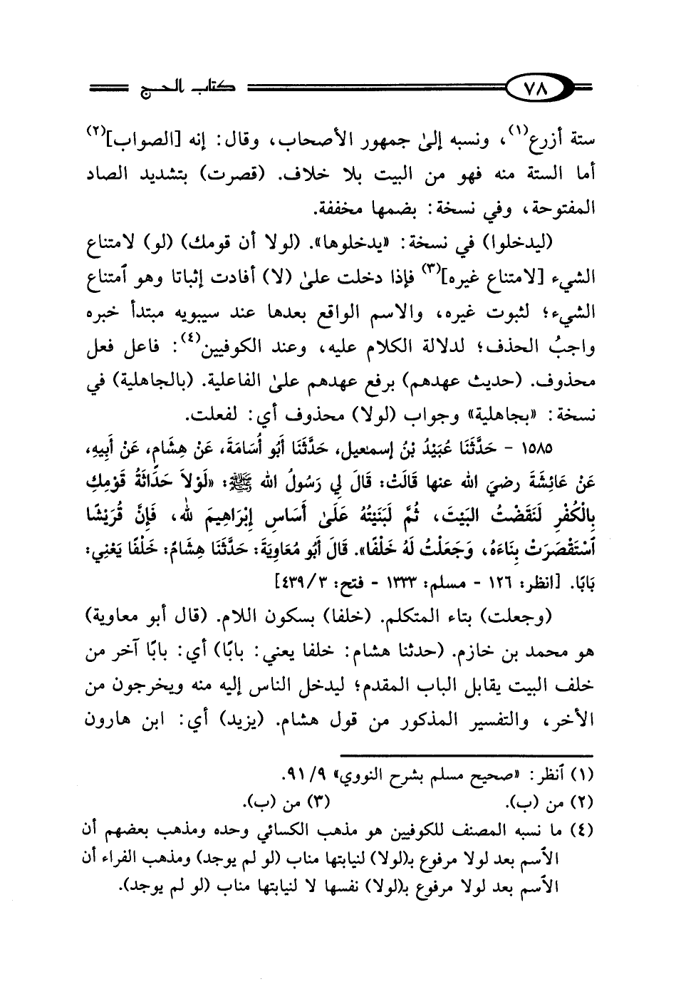 (ليدخلوا) في نسخة: "يدخلوها". (لولا أن قومك) (لو) لامتناع الشيء [لامتناع غيره] (¬3) فإذا دخلت على (لا) أفادت إثباتا وهو امتناع الشيء؛ لثبوت غيره، والاسم الواقع بعدها عند سيبويه مبتدأ خبره واجبُ الحذف؛ لدلالة الكلام عليه، وعند الكوفيين (¬4): فاعل فعل محذوف. (حديث عهدهم) برفع عهدهم على الفاعلية. (بالجاهلية) في نسخة: "بجاهلية" وجواب (لولا) محذوف أي: لفعلت.