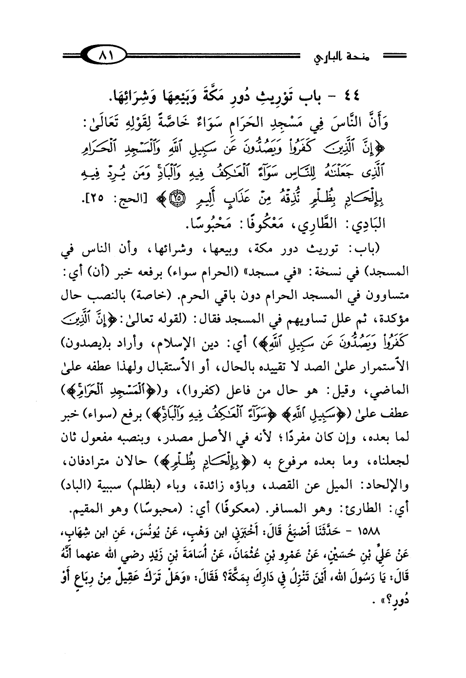 (باب: توريث دور مكّة، وبيعها، وشرائها، وأن النَّاس في المسجد) في نسخة: "في مسجد" (الحرام سواء) برفعه خبر (أن) أي: متساوون في المسجد الحرام دون باقي الحرم. (خاصّة) بالنصب حال مؤكدة، ثمّ علل تساويهم في المسجد فقال: (لقوله تعالى: {إِنَّ الَّذِينَ كَفَرُوا وَيَصُدُّونَ عَنْ سَبِيلِ اللَّهِ}) أي: دين الإسلام، وأراد بـ (يصدون) الاستمرار على الصد لا تقييده بالحال، أو الاستقبال ولهذا عطفه على الماضي، وقيل: هو حال من فاعل (كفروا)، و ({وَالْمَسْجِدِ الْحَرَامِ}) عطف على ({سَبِيلِ اللَّهِ} {سَوَاءً الْعَاكِفُ فِيهِ وَالْبَادِ}) برفع (سواء) خبر لما بعده، وإن كان مفردًا؛ لأنه في الأصل مصدر، وبنصبه مفعول ثان لجعلناه، وما بعده مرفوع به ({بِإِلْحَادٍ بِظُلْمٍ}) حالان مترادفان، والإلحاد: الميل عن القصد، وباؤه زائدة، وباء (بظلم) سببية (الباد) أي: الطارئ: وهو المسافر. (معكوفًا) أي: (محبوسًا) وهو المقيم.