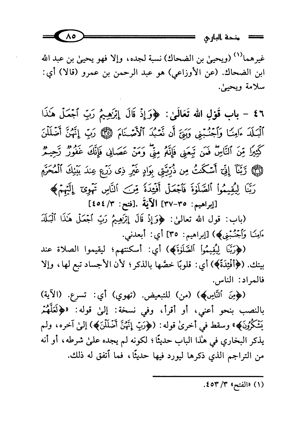 46 - بَابُ قَوْلِ اللَّهِ تَعَالَى: {وَإِذْ قَالَ إِبْرَاهِيمُ رَبِّ اجْعَلْ هَذَا البَلَدَ آمِنًا وَاجْنُبْنِي وَبَنِيَّ أَنْ نَعْبُدَ الأَصْنَامَ، رَبِّ إِنَّهُنَّ أَضْلَلْنَ كَثِيرًا مِنَ النَّاسِ فَمَنْ تَبِعَنِي فَإِنَّهُ مِنِّي، وَمَنْ عَصَانِي فَإِنَّكَ غَفُورٌ رَحِيمٌ. رَبَّنَا إِنِّي أَسْكَنْتُ مِنْ ذُرِّيَّتِي بِوَادٍ غَيْرِ ذِي زَرْعٍ عِنْدَ بَيْتِكَ المُحَرَّمِ رَبَّنَا لِيُقِيمُوا الصَّلاَةَ فَاجْعَلْ أَفْئِدَةً مِنَ النَّاسِ تَهْوِي إِلَيْهِمْ} [إبراهيم: 36] [إبراهيم: 34 - 37] الآيَةَ.