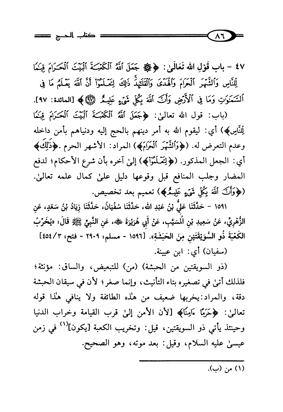 (باب: قول الله تعالى: {جَعَلَ اللَّهُ الْكَعْبَةَ الْبَيْتَ الْحَرَامَ قِيَامًا لِلنَّاسِ}) أي: ليقوم الله به أمر دينهم بالحج إليه ودنياهم بأمن داخله وعدم التعرض له. ({وَالشَّهْرَ الْحَرَامَ}) المراد: الأشهر الحرم. {ذَلِكَ} أي: الجعل المذكور. ({لِتَعْلَمُوا}) إلى آخره بأن شرع الأحكام؛ لدفع المضار وجلب المنافع قبل وقوعها دليل على كمال علمه تعالى. ({وَأَنَّ اللَّهَ بِكُلِّ شَيْءٍ عَلِيمٌ}) تعميم بعد تخصيص.