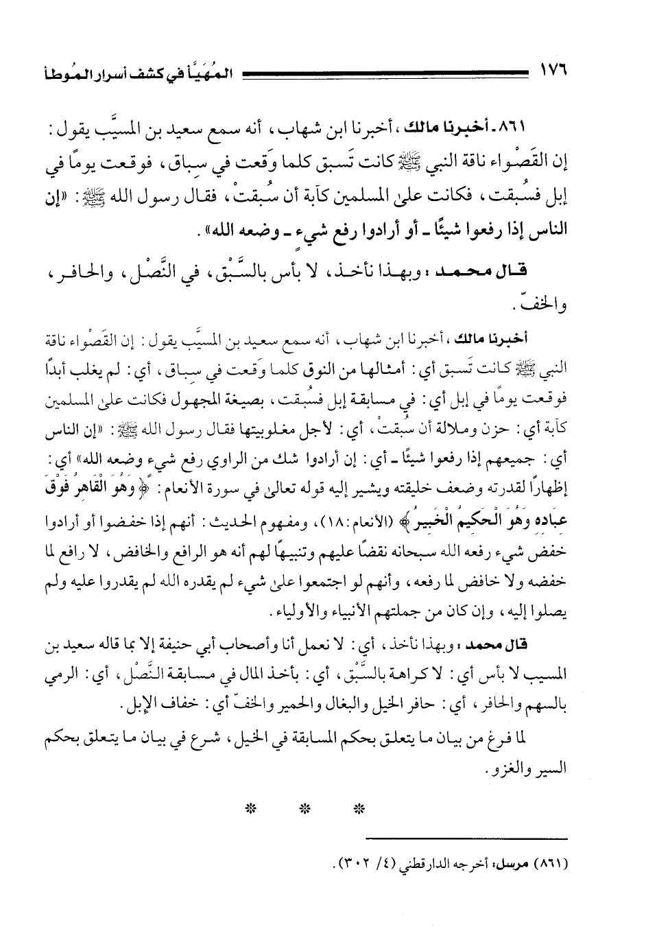 أخبرنا مالك، أخبرنا ابن شهاب، أنه سمع سعيد بن المسيَّب يقول: إن القَصْواء ناقة النبي - صلى الله عليه وسلم - كانت تَسبق أي: أمثالها من النوق كلما وَقعت في سِباق، أي: لم يغلب أبدًا فوقعت يومًا في إبل أي: في مسابقة إبل فسُبقت، بصيغة المجهول فكانت على المسلمين كآبة أي: حزن وملالة أن سُبقتْ، أي: لأجل مغلوبيتها فقال رسول الله - صلى الله عليه وسلم -: "إن الناس أي: جميعهم إذا رفعوا شيئًا - أي: إن أرادوا شك من الراوي رفع شيء وضعه الله" أي: إظهارًا لقدرته وضعف خليقته ويشير إليه قوله تعالى في سورة الأنعام: {وَهُوَ الْقَاهِرُ فَوْقَ عِبَادِهِ وَهُوَ الْحَكِيمُ الْخَبِيرُ} [الأنعام: 18]، ومفهوم الحديث أنهم إذا خفضوا أو أرادوا خفض شيء رفعه الله سبحانه نقضًا عليهم وتنبيهًا لهم أنه هو الرافع والخافض، لا رافع لما خفضه ولا خافض لما رفعه، وأنهم لو اجتمعوا على شيء لم يقدره الله لم يقدروا عليه ولم يصلوا إليه، وإن كان من جملتهم الأنبياء والأولياء.