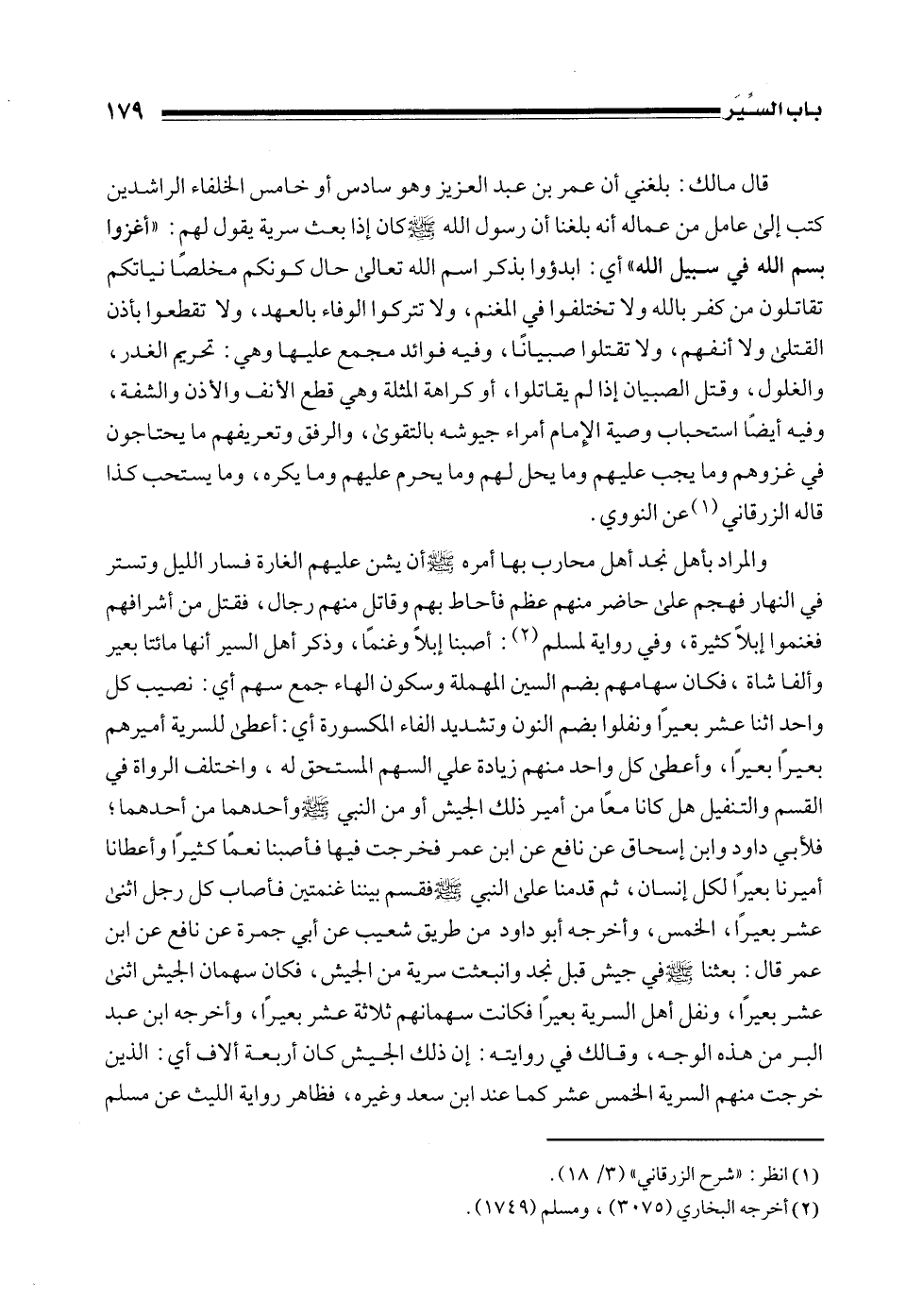 قال مالك: بلغني أن عمر بن عبد العزيز وهو سادس أو خامس الخلفاء الراشدين كتب إلى عامل من عماله أنه بلغنا أن رسول الله - صلى الله عليه وسلم - كان إذا بعث سرية يقول لهم: "أغزوا بسم الله في سبيل الله" أي: ابدؤوا بذكر اسم الله تعالى حال كونكم مخلصًا نياتكم تقاتلون من كفر بالله ولا تختلفوا في المغنم، ولا تتركوا الوفاء بالعهد، ولا تقطعوا بأذن القتلى ولا أنفهم، ولا تقتلوا صبيانًا، وفيه فوائد مجمع عليها وهي: تحريم الغدر، والغلول، وقتل الصبيان إذا لم يقاتلوا، أو كراهة المثلة وهي قطع الأنف والأذن والشفة، وفيه أيضًا استحباب وصية الإِمام أمراء جيوشه بالتقوى، والرفق وتعريفهم ما يحتاجون في غزوهم وما يجب عليهم وما يحل لهم وما يحرم عليهم وما يكره، وما يستحب كذا قاله الزرقاني (¬1) عن النووي.