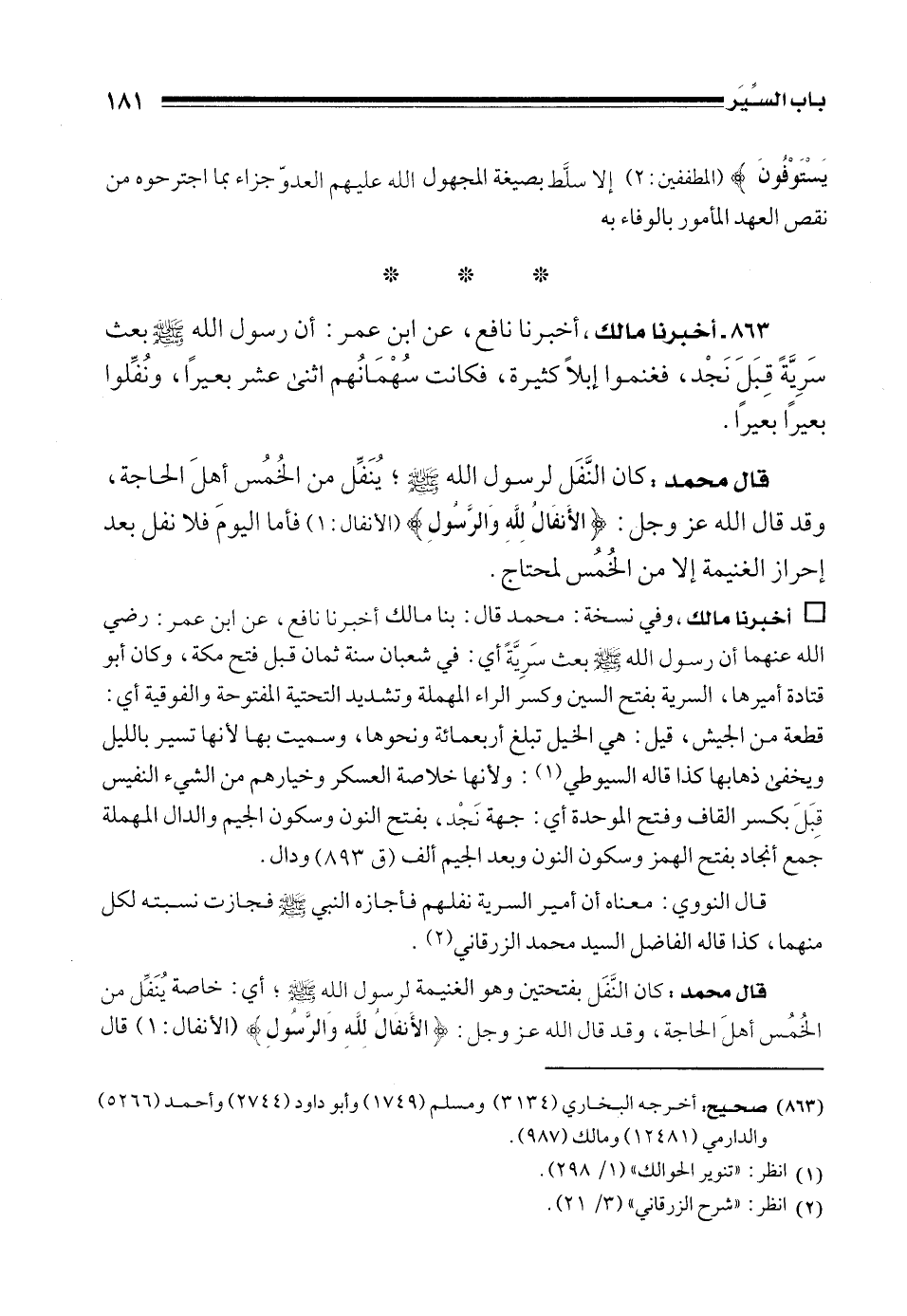 863 - أخبرنا مالك، أخبرنا نافع، عن ابن عمر: أن رسول الله - صلى الله عليه وسلم - بعث سَرِيَّةً قِبَلَ نَجْد، فغنموا إبلًا كثيرة، فكانت سُهْمَانُهم اثنى عشر بعيرًا، ونُفِّلوا بعيرًا بعيرًا.