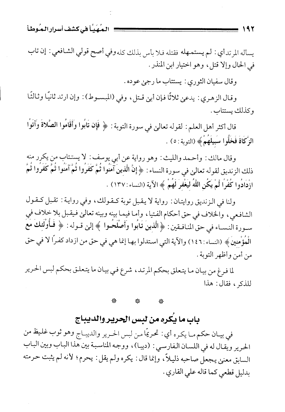 لما فرغ من بيان ما يتعلق بحكم المرتد، شرع في بيان ما يتعلق بحكم لبس الحرير للذكر، فقال: هذا