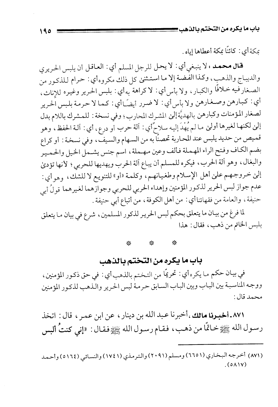 قال محمد: لا ينبغي أي: لا يحل للرجل المسلم أي: العاقل أن يلبس الحريري والديباج والذهب، وكذا الفضة إلا ما استثنى كل ذلك مكروه أي: حرام للذكور من الصغار فيه خلافًا والكبار، ولا بأس أي: لا كراهة به أي: بلبس الحرير وغيره للإِناث، أي: كبارهن وصغارهن ولا بأس أي: لا ضرر أيضًا أي: كما لا حرمة بلبس الحرير لصغار المؤمنات وكبارهن بالهديَّة إلى المشرك المحارب؛ وفي نسخة: للمشرك باللام بدل إلى لكنها لغيرها أولى ما لم يُهدَ إليه سلاحٌ أي: آلة حرب أو درع، أي: آلة الحفظ، وهو قميص من حديد يلبس عند المحاربة تحصنًا به من السهام والسيف، وفي نسخة: أو كراع بضم الكاف وفتح الراء المهملة فألف وعين مهملة، اسم جنس يشمل الخيل والحمير والبغال، وهو آلة الحرب، فيكره للمسلم أن يباع آلة الحرب ويهديها للحربي؛ لأنها تؤدى إلى خروجهم على أهل الإِسلام وطغيانهم، وكلمة "أو" للتنويع لا للشك، وهو أي: عدم جواز لبس الحرير لذكور المؤمنين وإهداء الحربي للحربي وجوازهما لغيرهما قولُ أي حنيفة، والعامة من فقهائنا أي: من أهل الكوفة، من أتباع أبي حنيفة.
