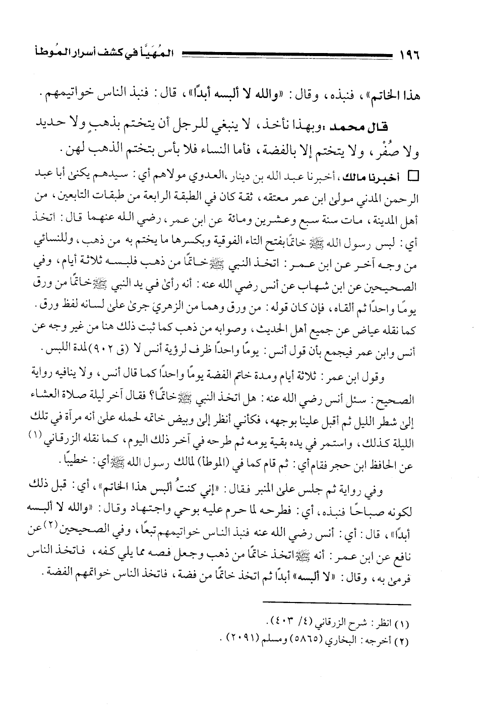 • أخبرنا مالك، أخبرنا عبد الله بن دينار، العدوي مولاهم أي: سيدهم يكنى أبا عبد الرحمن المدني مولى ابن عمر معتقه، ثقة كان في الطبقة الرابعة من طبقات التابعين، من أهل المدينة، مات سنة سبع وعشرين ومائة عن ابن عمر، رضي الله عنهما قال: اتخذ أي: لبس رسول الله - صلى الله عليه وسلم - خاتمًا بفتح التاء الفوقية وبكسرها ما يختم به من ذهب، وللنسائي من وجه آخر عن ابن عمر: اتخذ النبي - صلى الله عليه وسلم - خاتمًا من ذهب فلبسه ثلاثة أيام، وفي الصحيحين عن ابن شهاب عن أنس رضي الله عنه: أنه رأى في يد النبي - صلى الله عليه وسلم - خاتمًا من ورق يومًا واحدًا ثم ألقاه، فان كان قوله: من ورق وهما من الزهري جرى على لسانه لفظ ورق. كما نقله عياض عن جميع أهل الحديث، وصوابه من ذهب كما ثبت ذلك هنا من غير وجه عن أنس وابن عمر فيجمع بأن قول أنس: يومًا واحدًا ظرف لرؤية أنس لا (ق 902) لمدة اللبس.