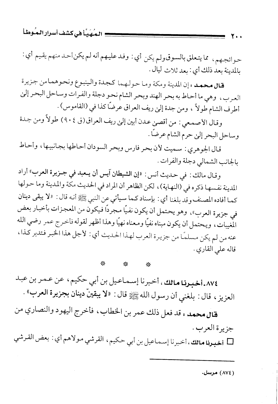 874 - أخبرنا مالك، أخبرنا إسماعيل بن أبي حكيم، عن عمر بن عبد العزيز، قال: بلغني أن رسول الله - صلى الله عليه وسلم - قال: "لا يبقينّ دينان بجزيرة العرب".